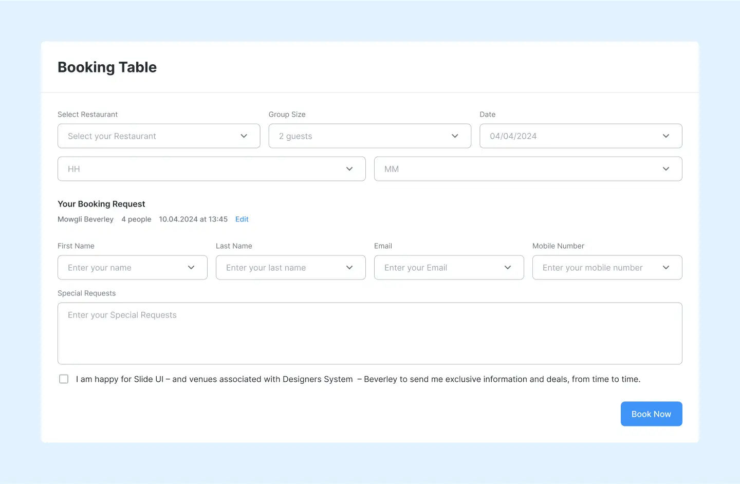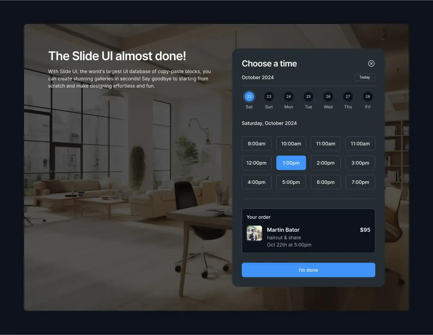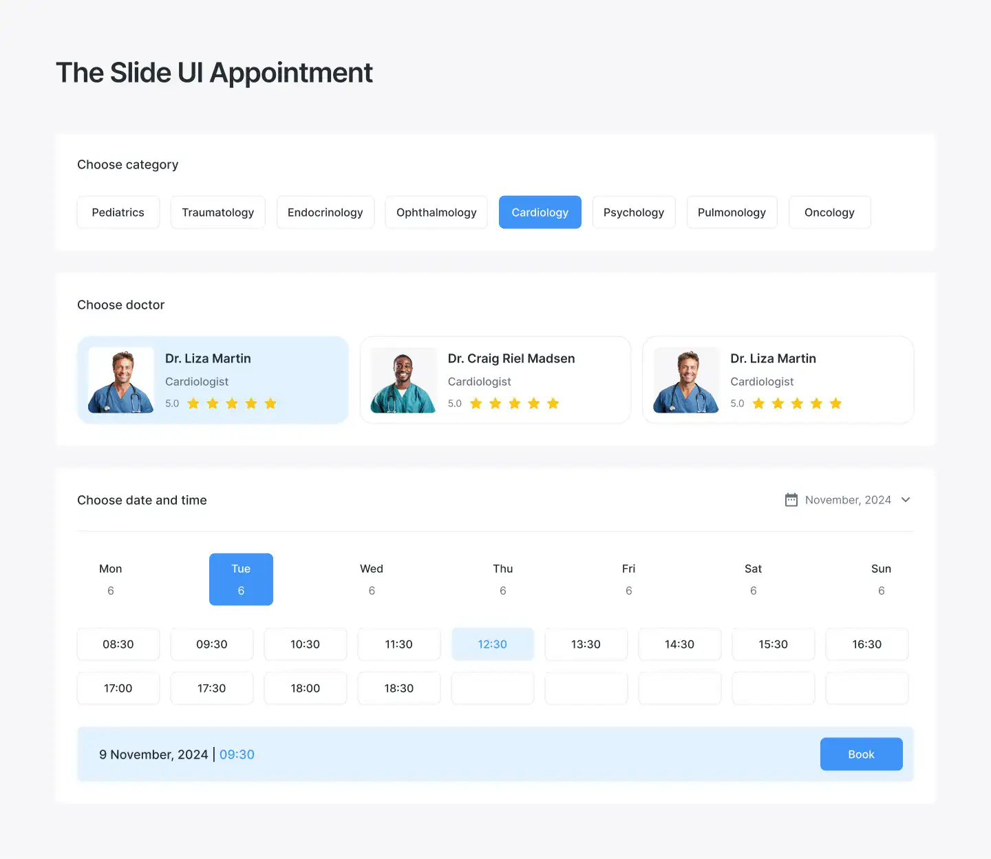 Ideal for SaaS, clinics, or consultants — built-in date selectors, confirmations, and booking steps.