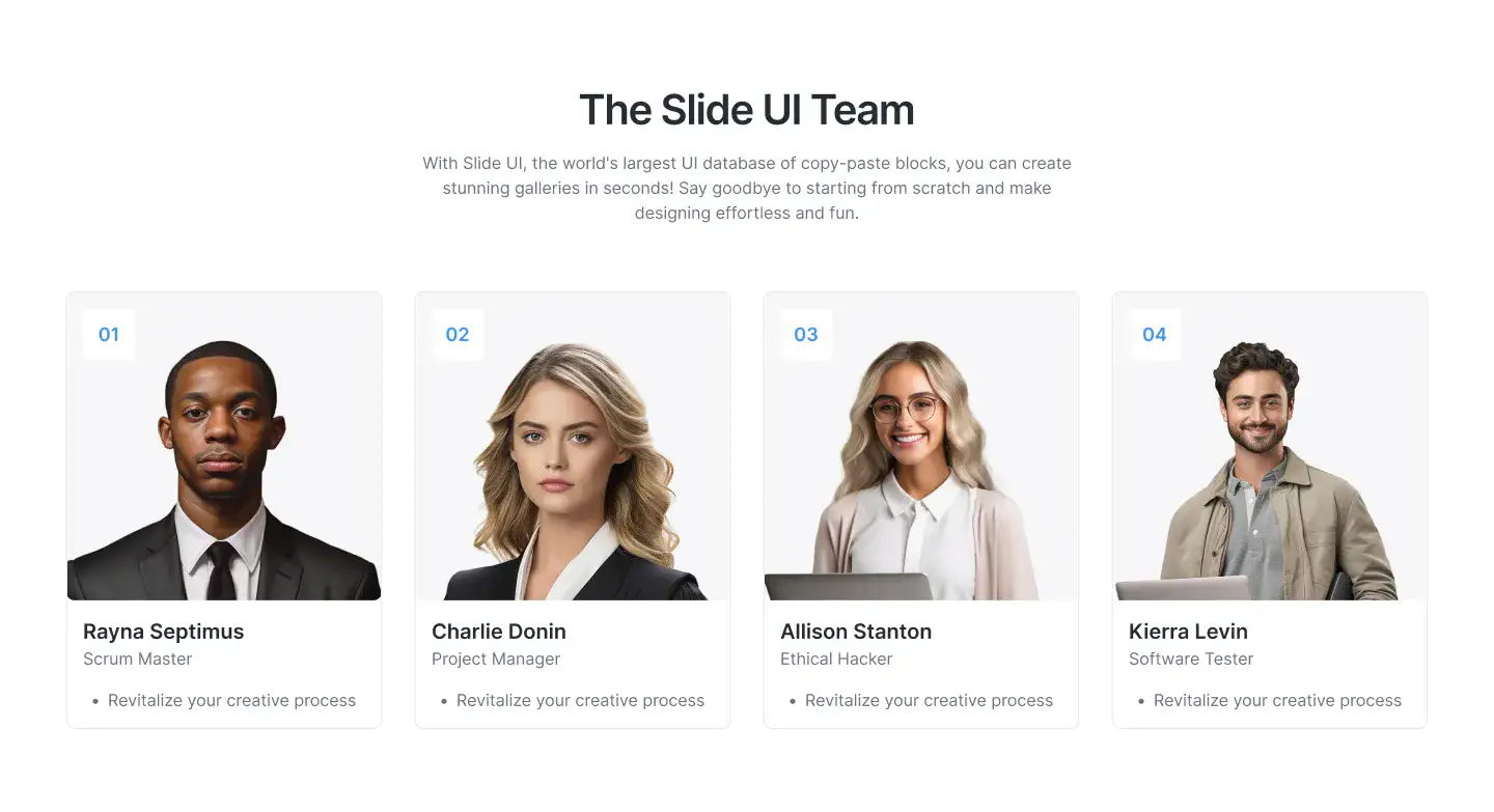 View Hero blocksShowcase processes, features, or onboarding in a clean 3–4 step layout. These are perfect for explaining complex ideas simply.