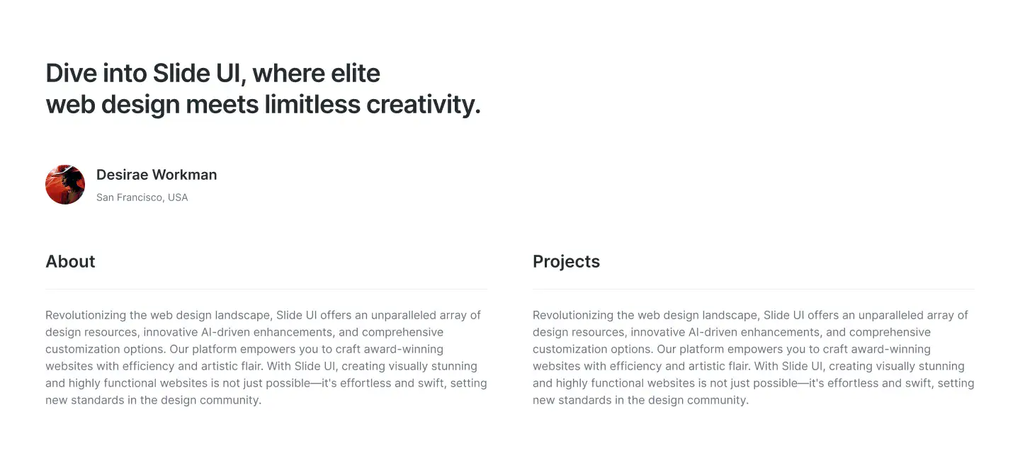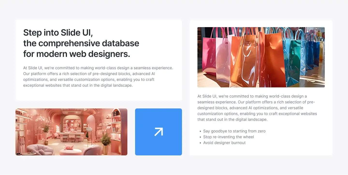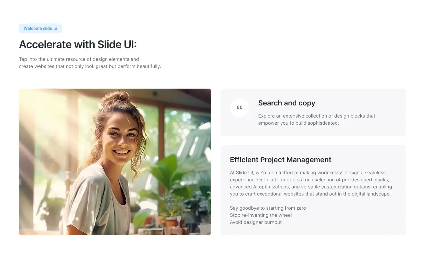 Lightweight sections for storytelling, intros, or visual breaks. Ideal for portfolios, agencies, and SaaS.