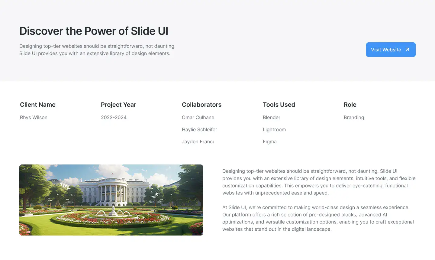Show project results and stories in a professional way. Includes visual storytelling, stats, and client quotes.