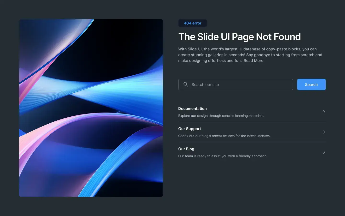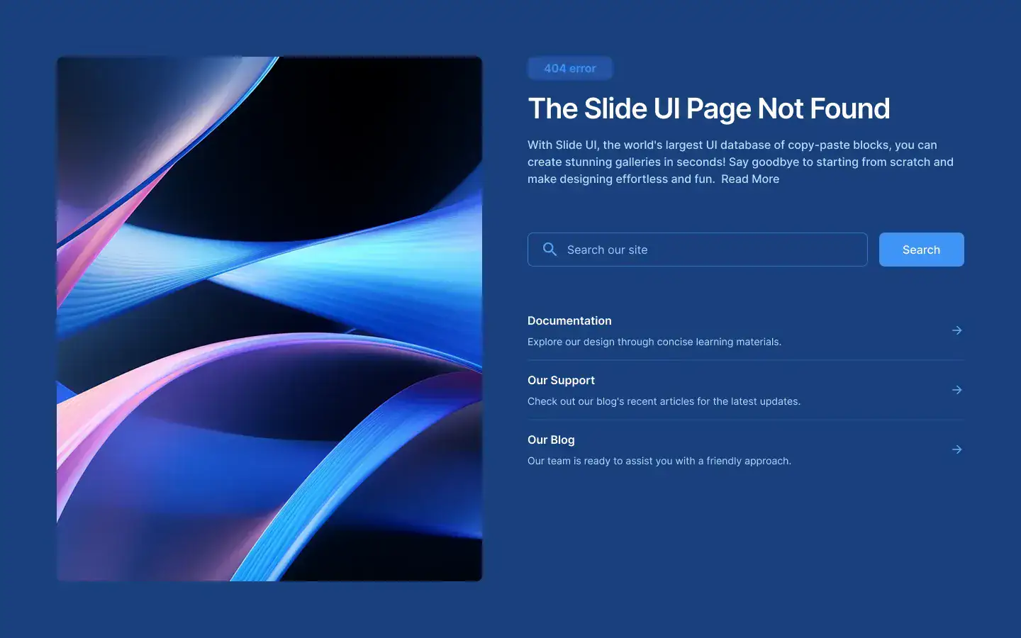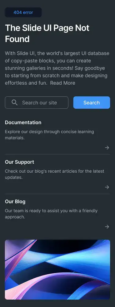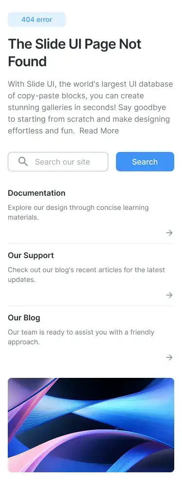 Minimal, branded 404 blocks that guide users back on track. Includes illustrations or CTAs.