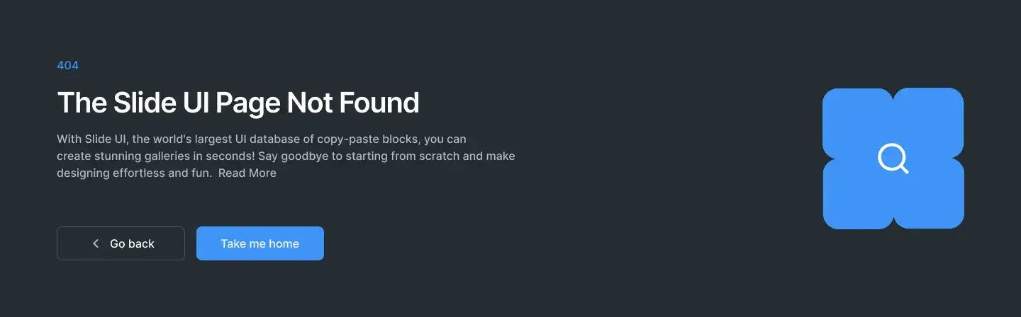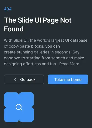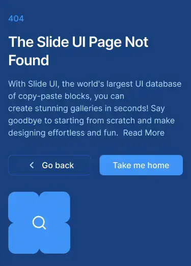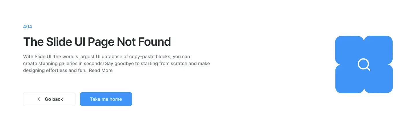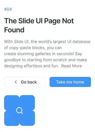 Minimal, branded 404 blocks that guide users back on track. Includes illustrations or CTAs.