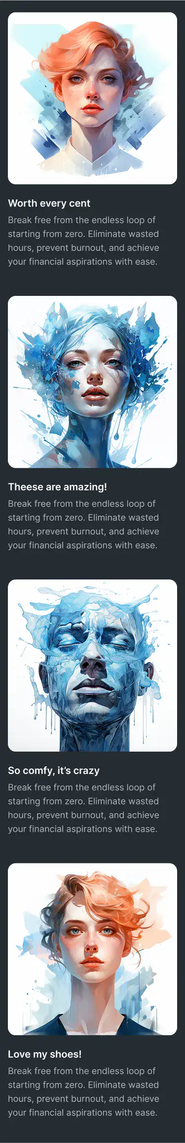 High-trust testimonial sections with avatars, logos, quotes, or carousels. Designed to increase credibility and conversions.