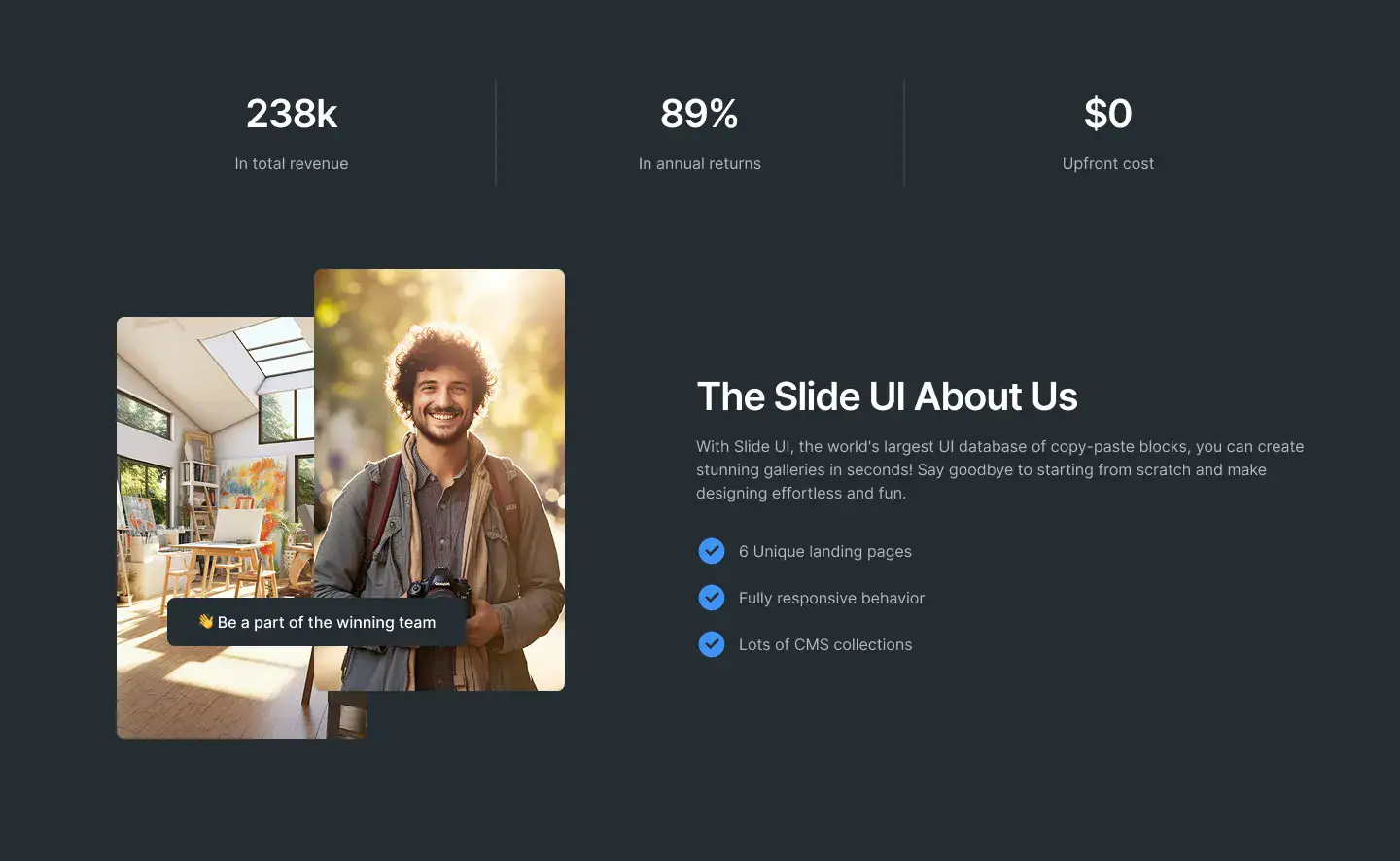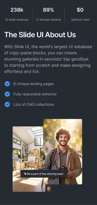 Lightweight sections for storytelling, intros, or visual breaks. Ideal for portfolios, agencies, and SaaS.