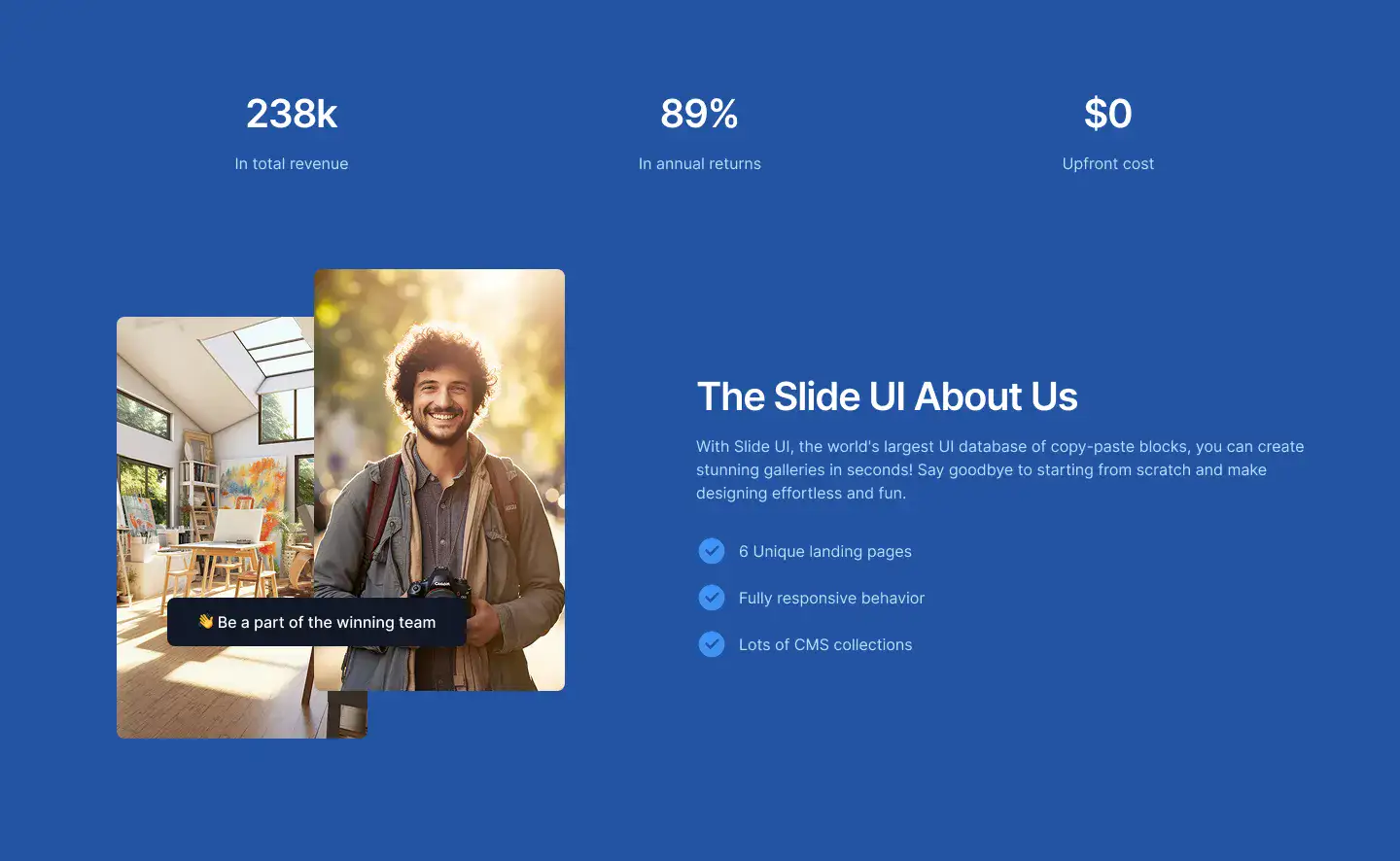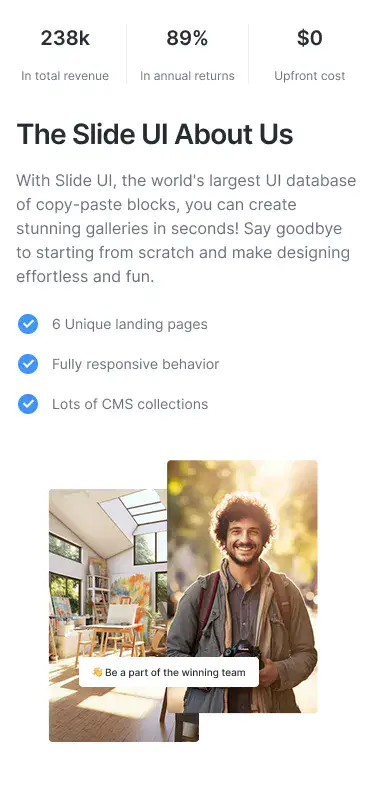 No more rebuilding from scratch. Snap layouts in minutes and launch faster — trusted by the worlds best designers, devs & marketers.
