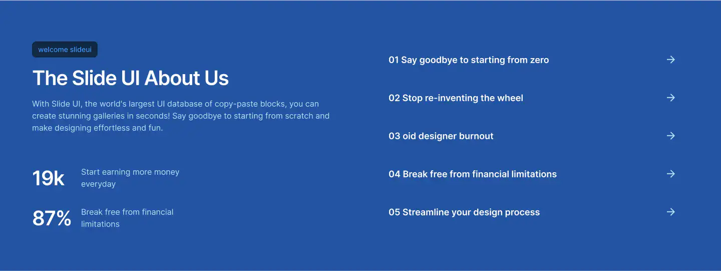 View Benefit / Statistic blocksPerfect for agencies, consultants, and SaaS tools to clearly explain services offered, with icon, card, or list formats.
