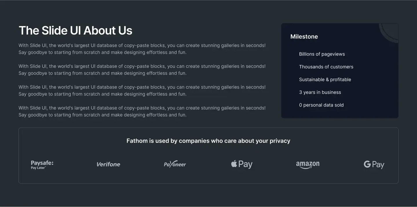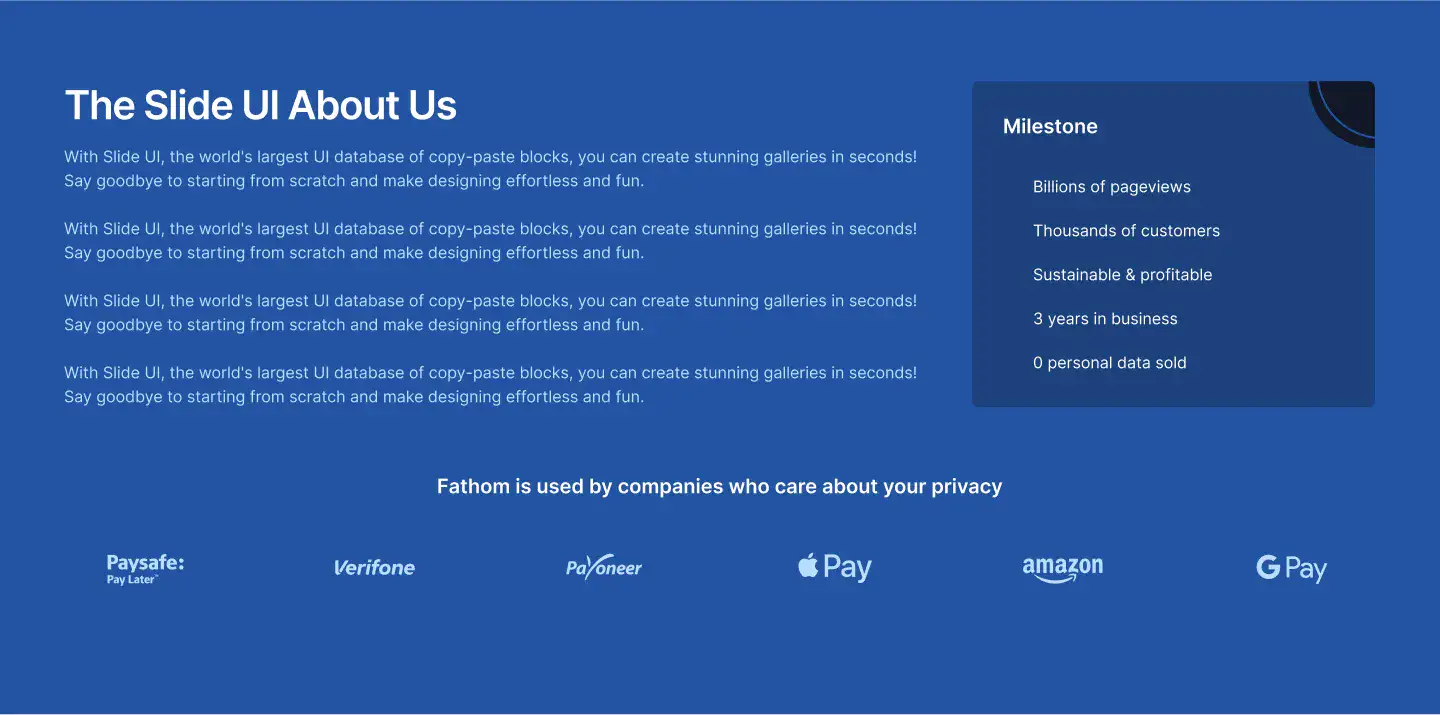 Add story, mission, and credibility to your brand with timeline, image-text, or culture-based layouts.