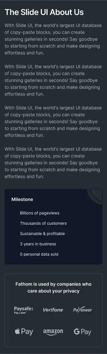 Lightweight sections for storytelling, intros, or visual breaks. Ideal for portfolios, agencies, and SaaS.