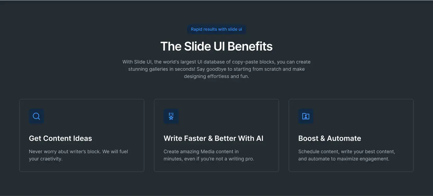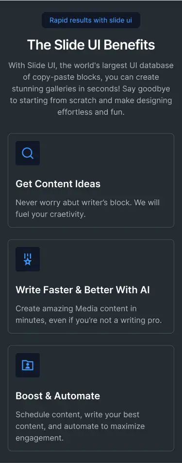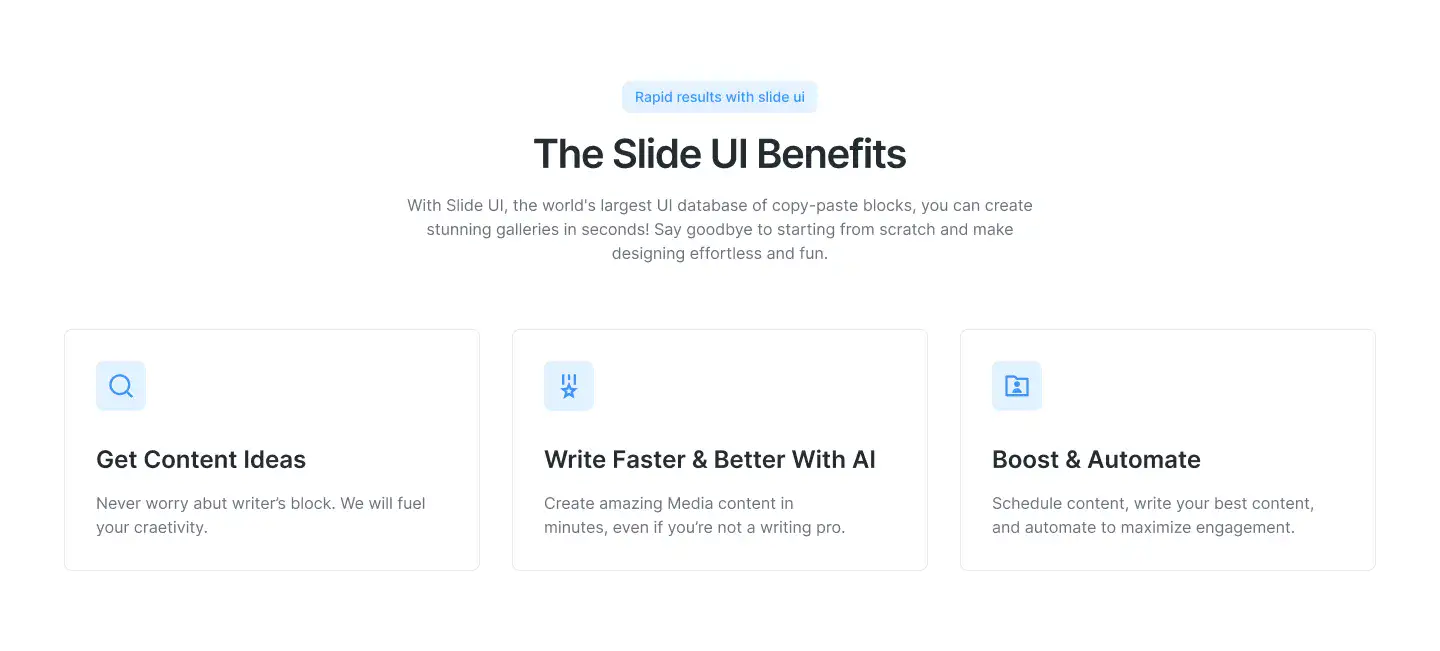 Grid or column-based layouts to highlight your best product features — fast, skimmable, and easy to reuse.