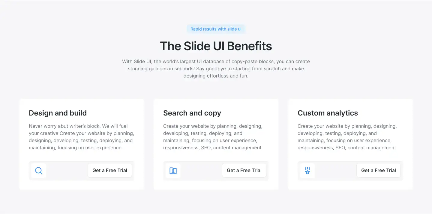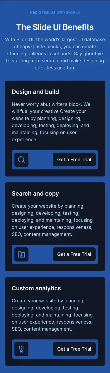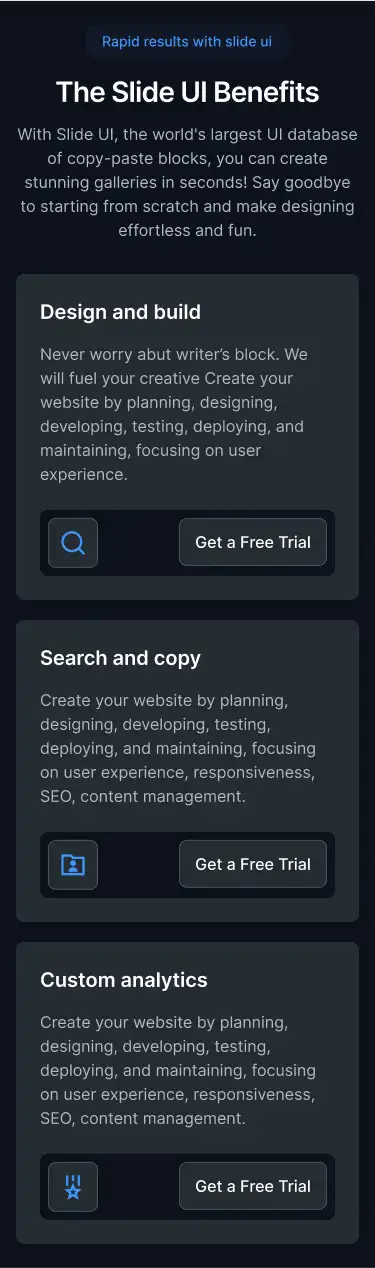 Grid or column-based layouts to highlight your best product features — fast, skimmable, and easy to reuse.