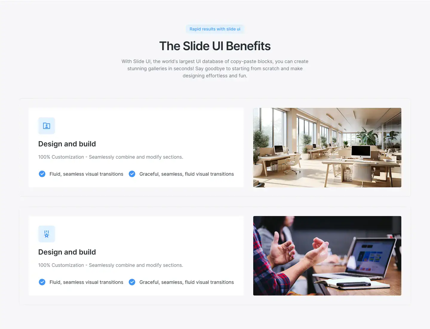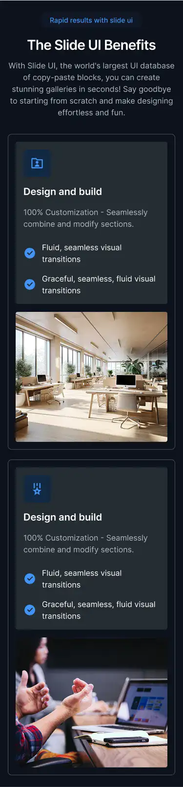 Grid or column-based layouts to highlight your best product features — fast, skimmable, and easy to reuse.