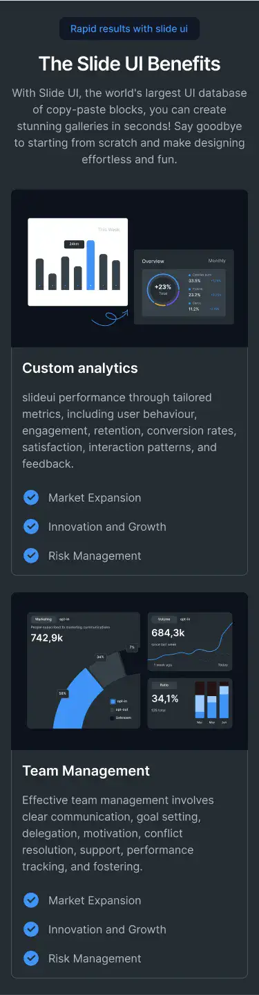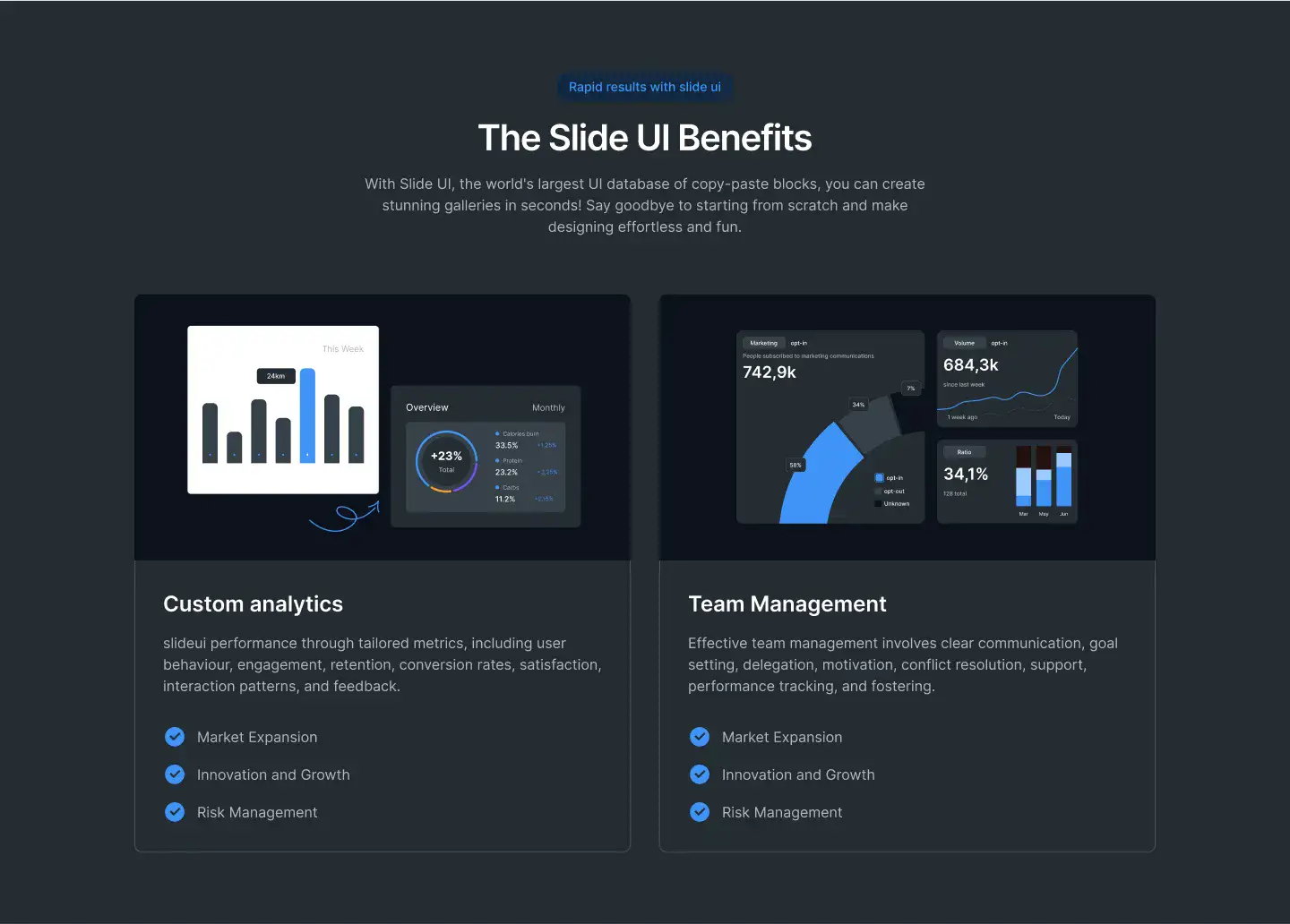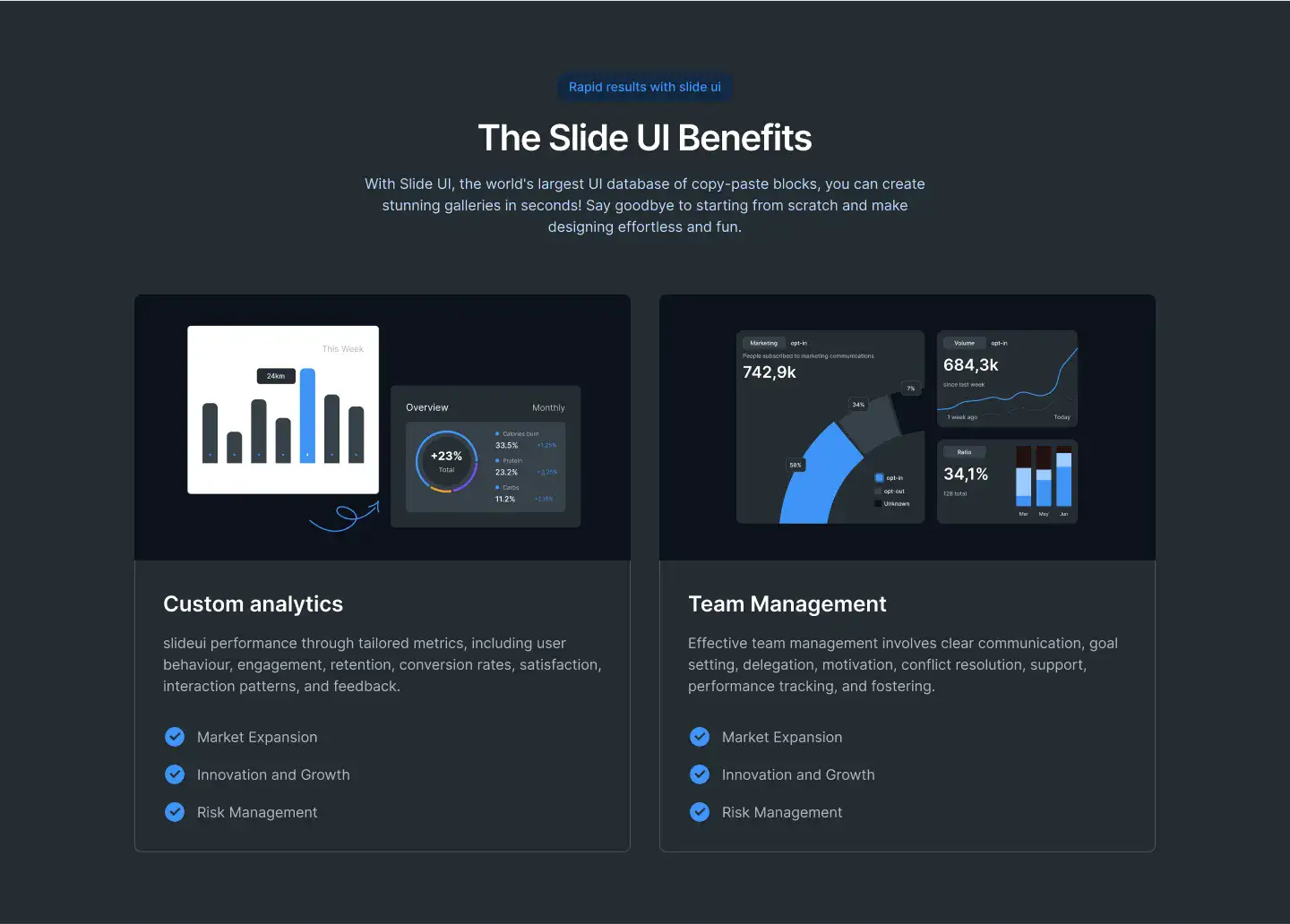 View Benefit / Statistic blocksPerfect for agencies, consultants, and SaaS tools to clearly explain services offered, with icon, card, or list formats.