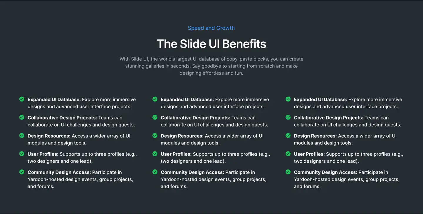 Grid or column-based layouts to highlight your best product features — fast, skimmable, and easy to reuse.