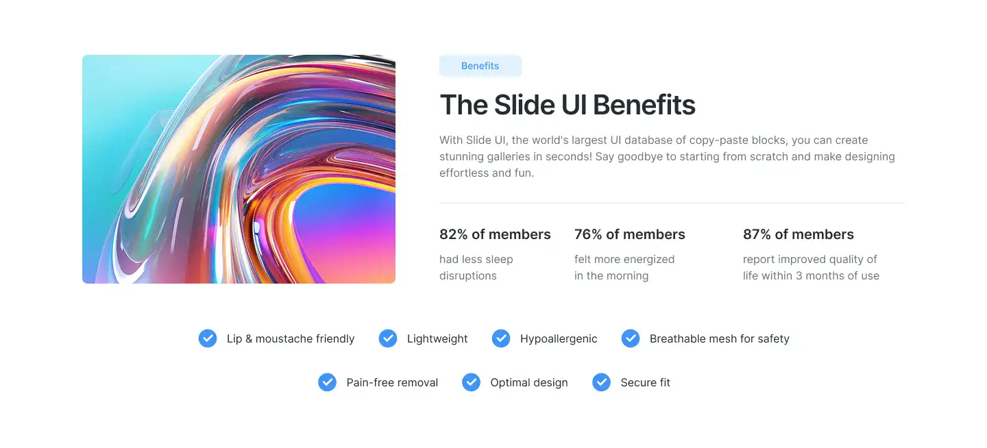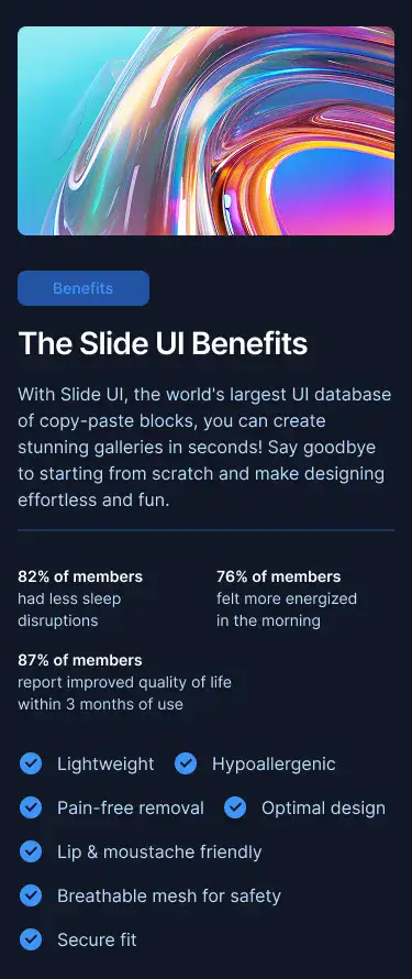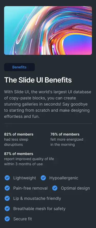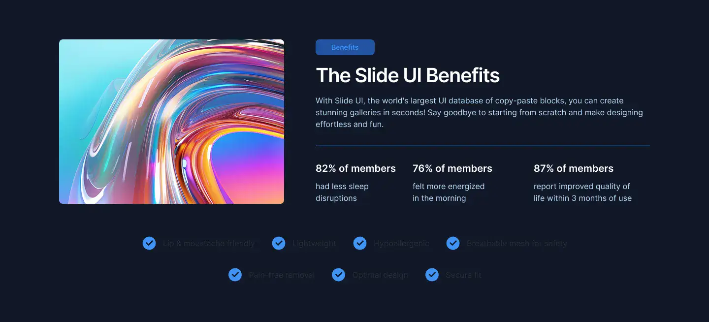 Benefits Statistics Layout for Figma — modern, themeable and responsive across Desktop, Tablet and Mobile. Includes Light, Dark and Accent modes for fast customisation. Ideal for Ecommerce, Fitness, Insurance.