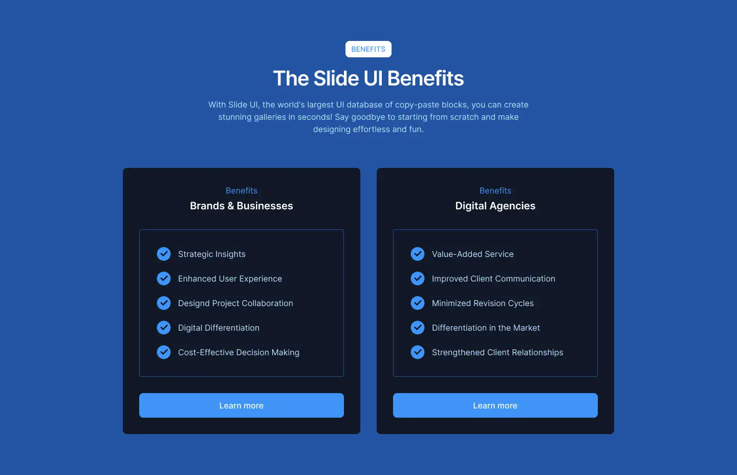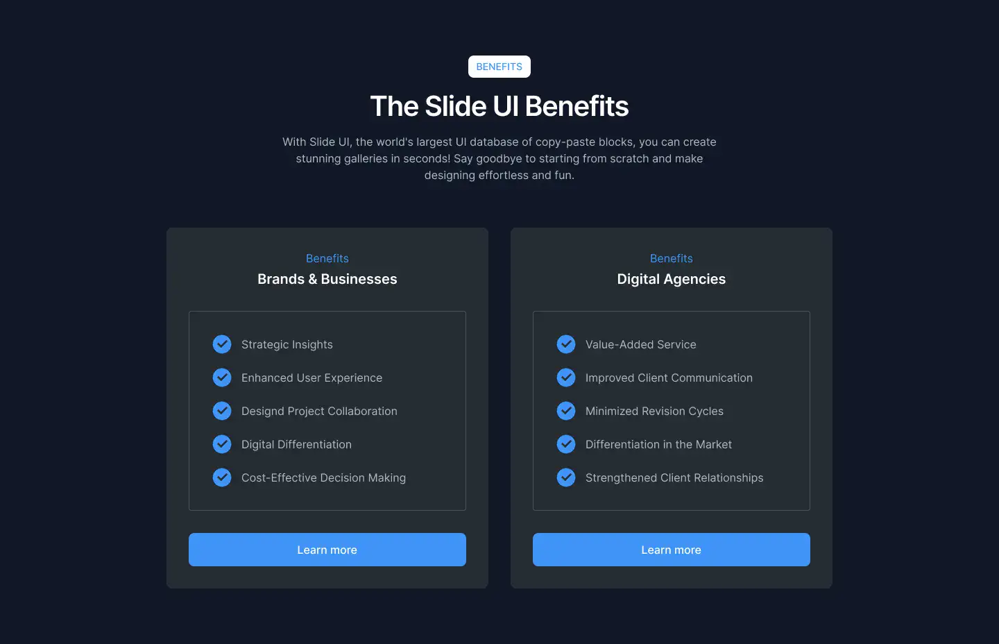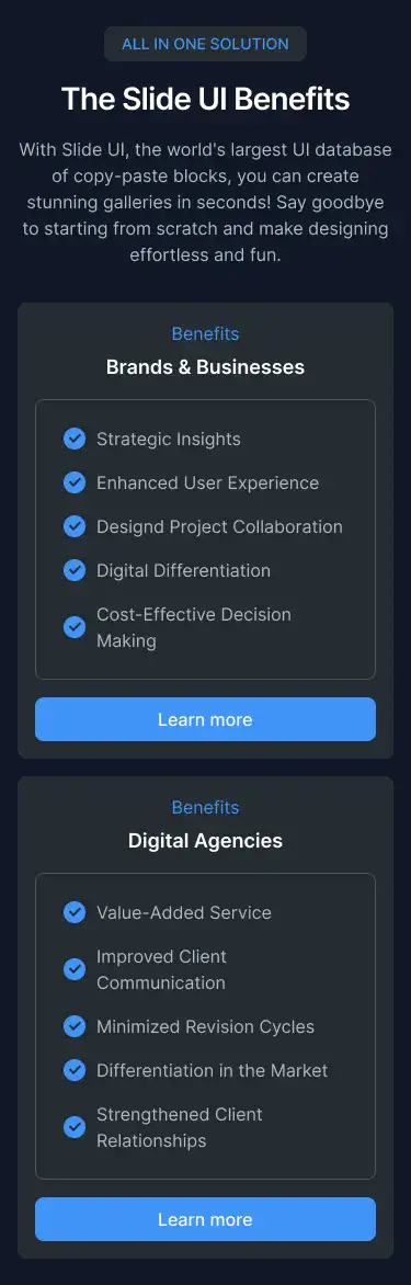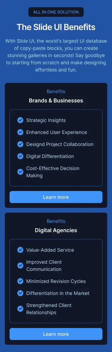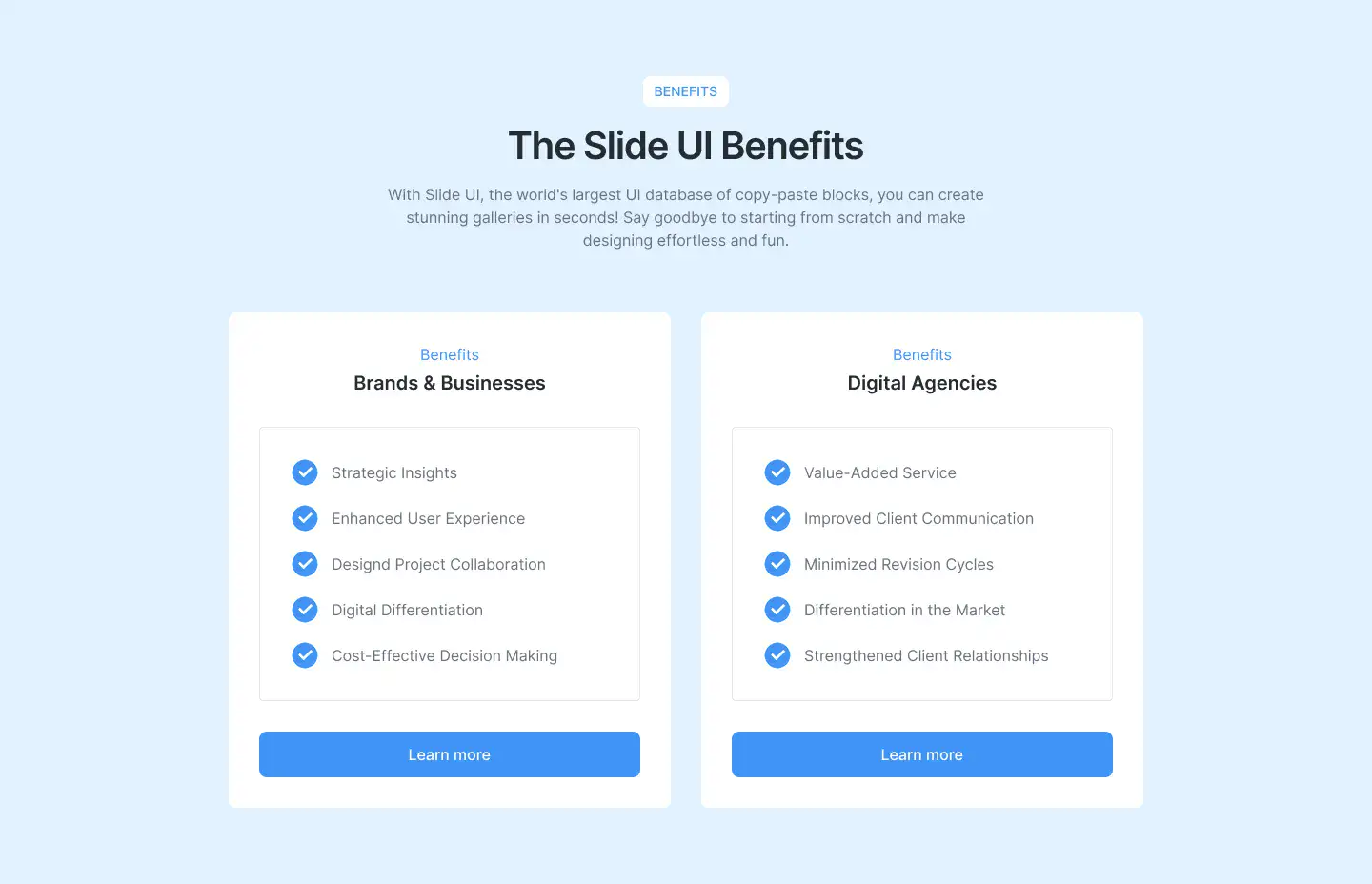 View Benefit / Statistic blocksPerfect for agencies, consultants, and SaaS tools to clearly explain services offered, with icon, card, or list formats.