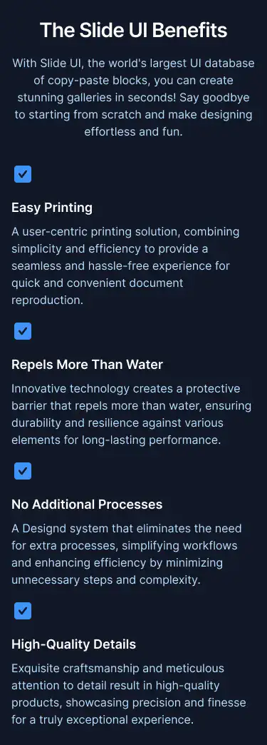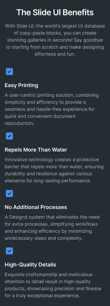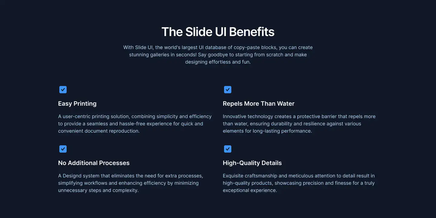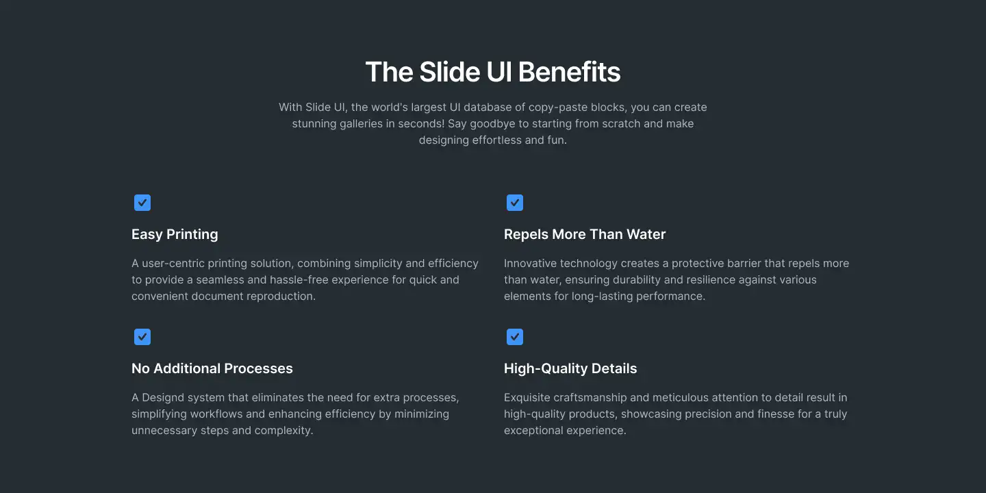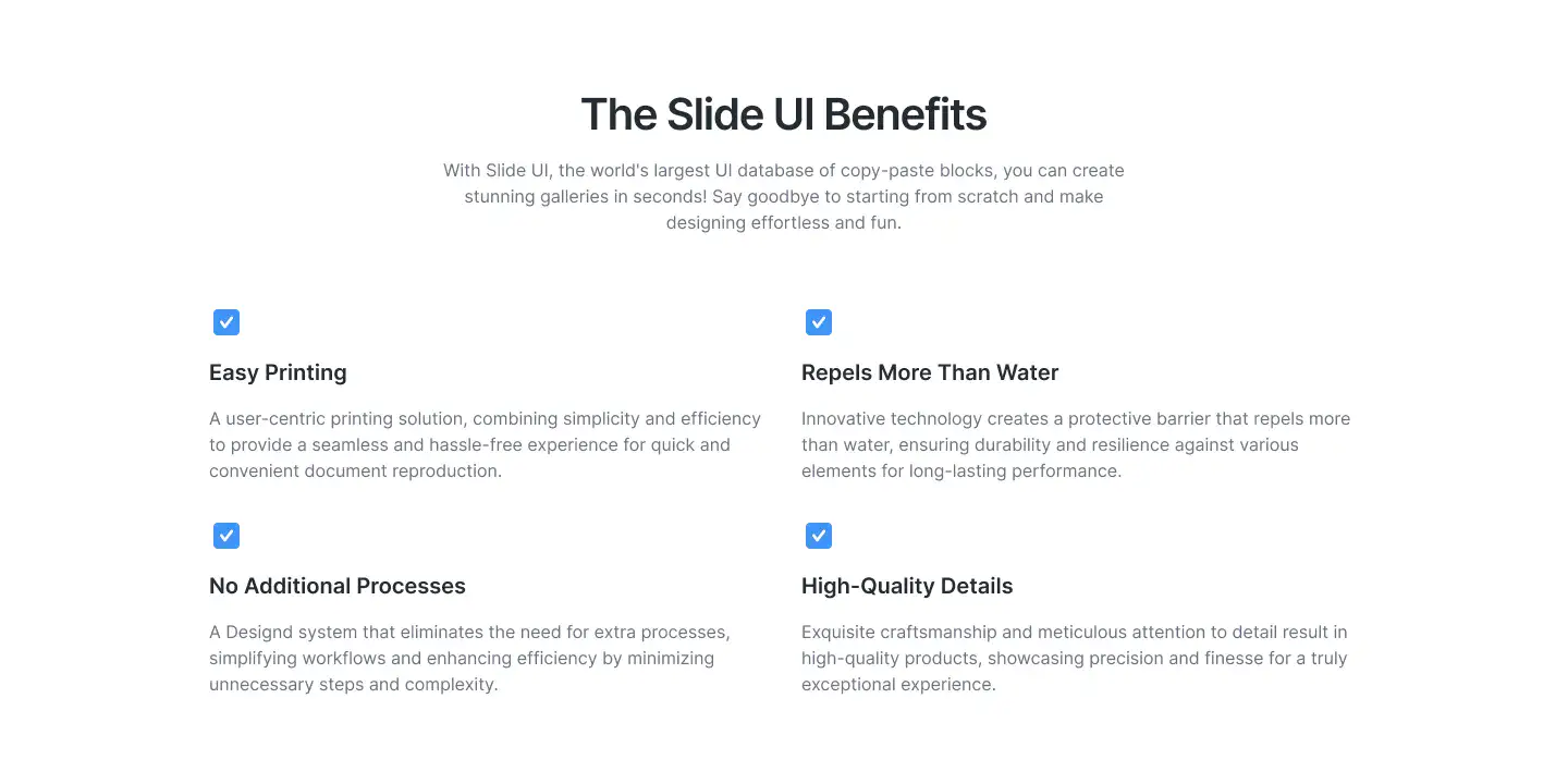 Grid or column-based layouts to highlight your best product features — fast, skimmable, and easy to reuse.