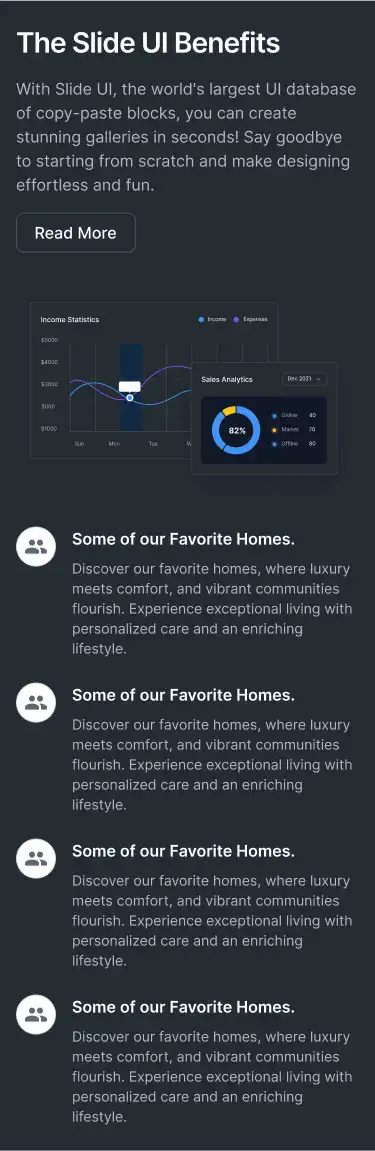 View Benefit / Statistic blocksPerfect for agencies, consultants, and SaaS tools to clearly explain services offered, with icon, card, or list formats.