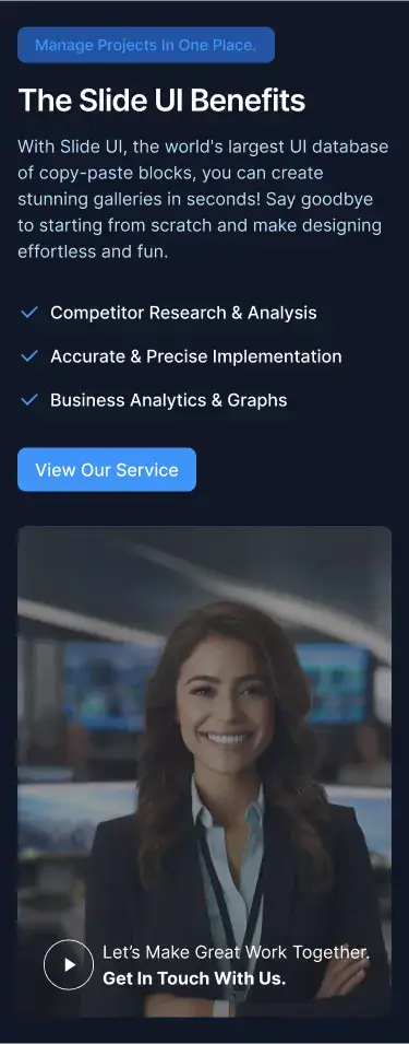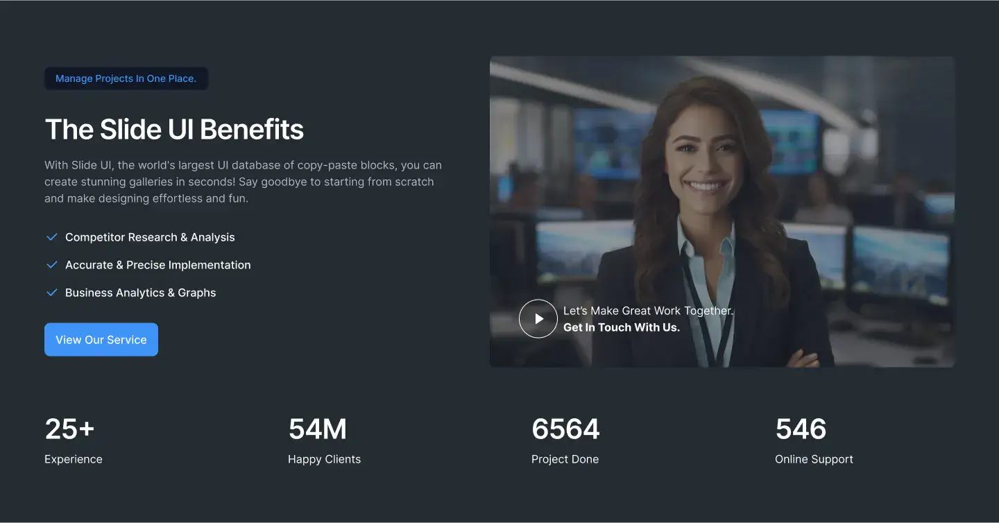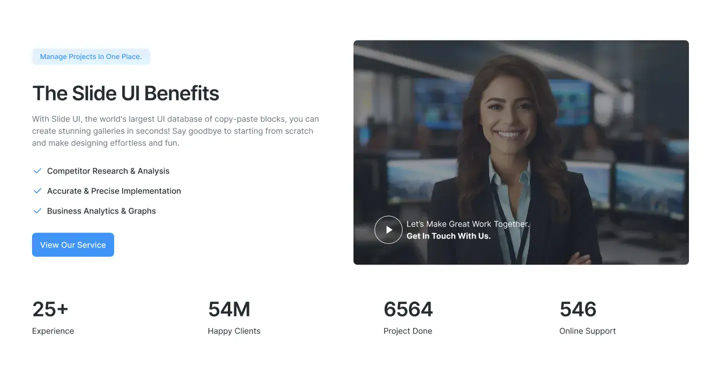 View Benefit / Statistic blocksPerfect for agencies, consultants, and SaaS tools to clearly explain services offered, with icon, card, or list formats.