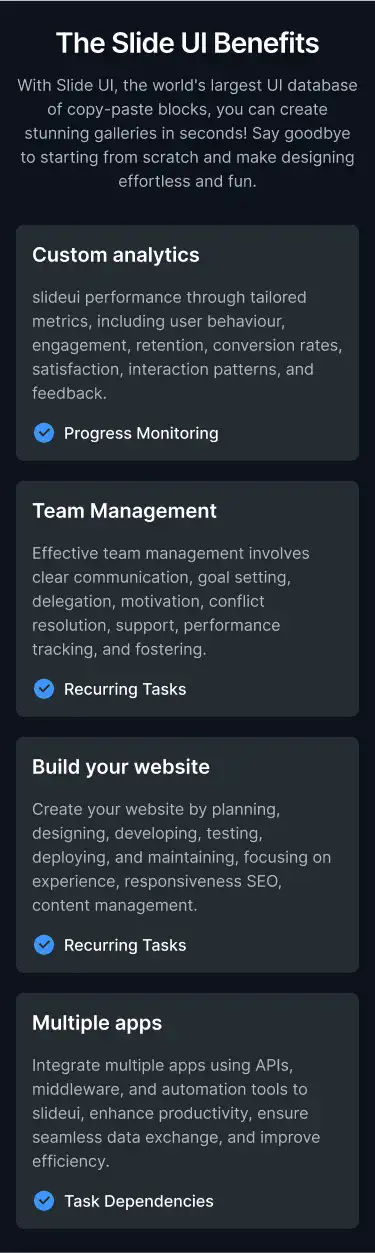 Grid or column-based layouts to highlight your best product features — fast, skimmable, and easy to reuse.