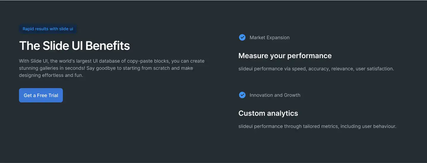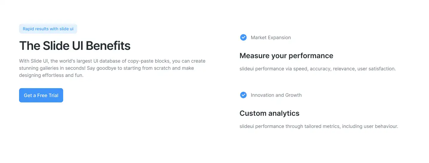 View Benefit / Statistic blocksPerfect for agencies, consultants, and SaaS tools to clearly explain services offered, with icon, card, or list formats.