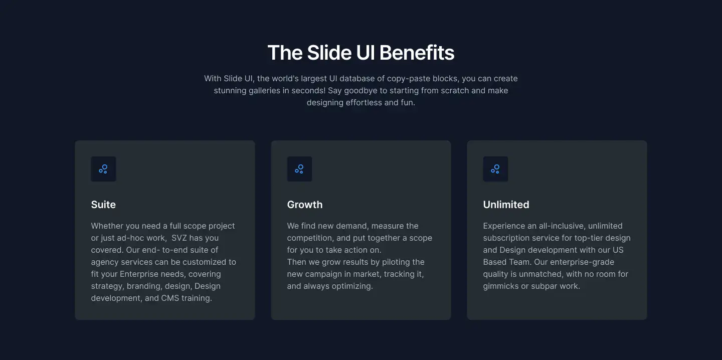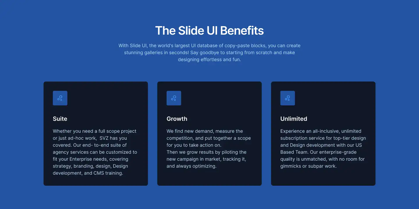 Grid or column-based layouts to highlight your best product features — fast, skimmable, and easy to reuse.