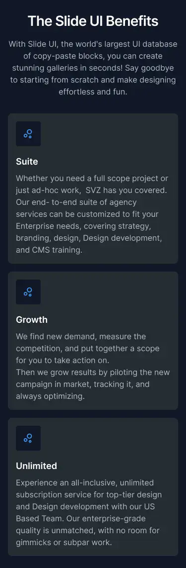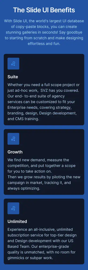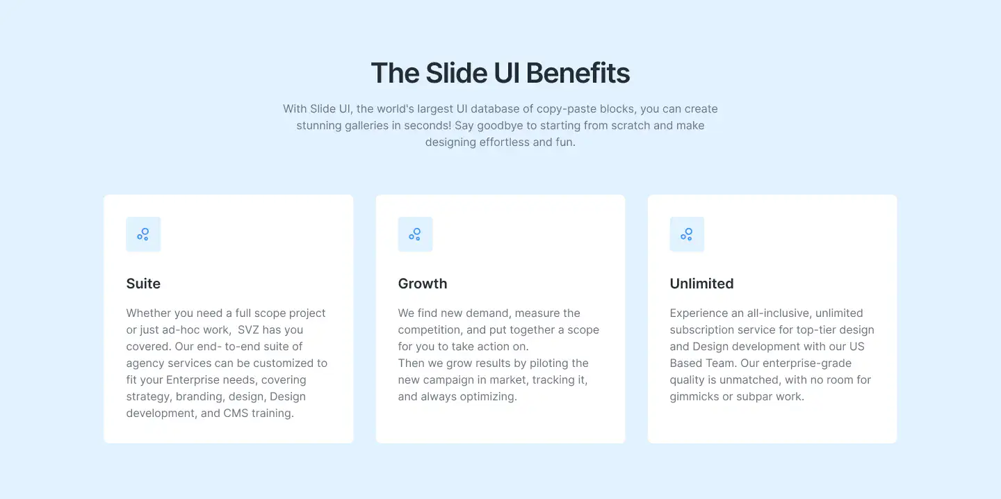 View Benefit / Statistic blocksPerfect for agencies, consultants, and SaaS tools to clearly explain services offered, with icon, card, or list formats.
