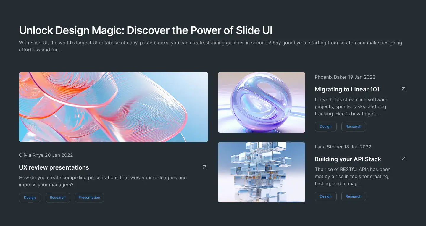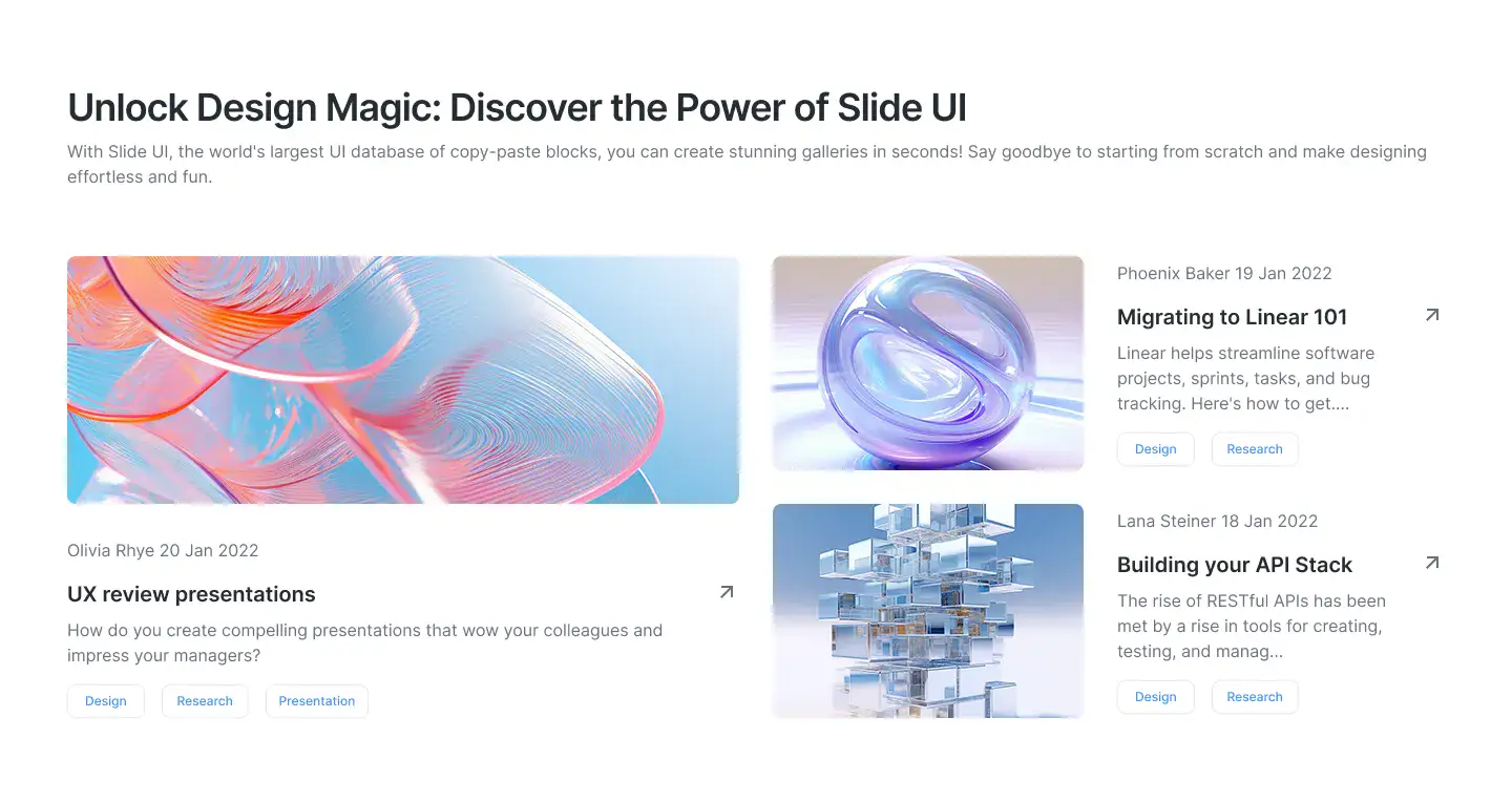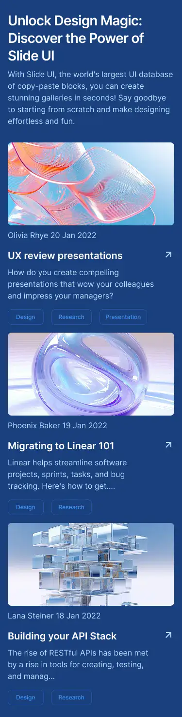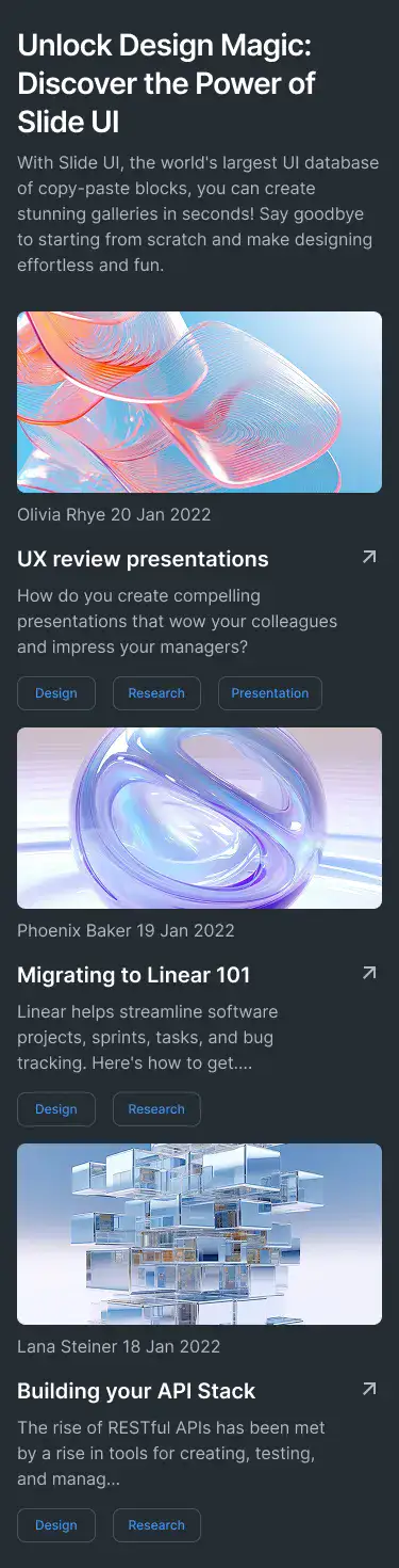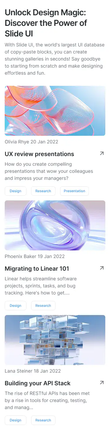 Display posts with preview cards, titles, and tags. Perfect for content hubs or design resource libraries.
