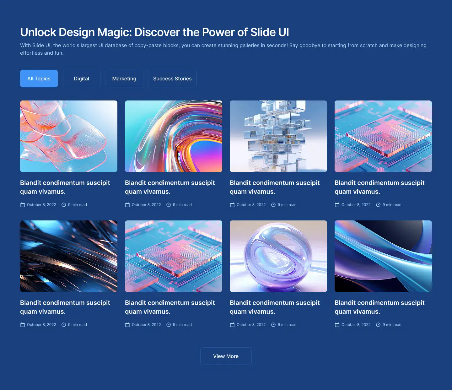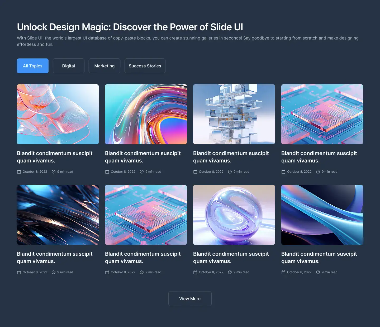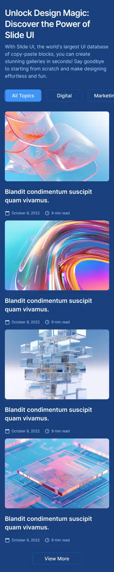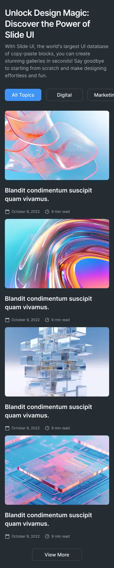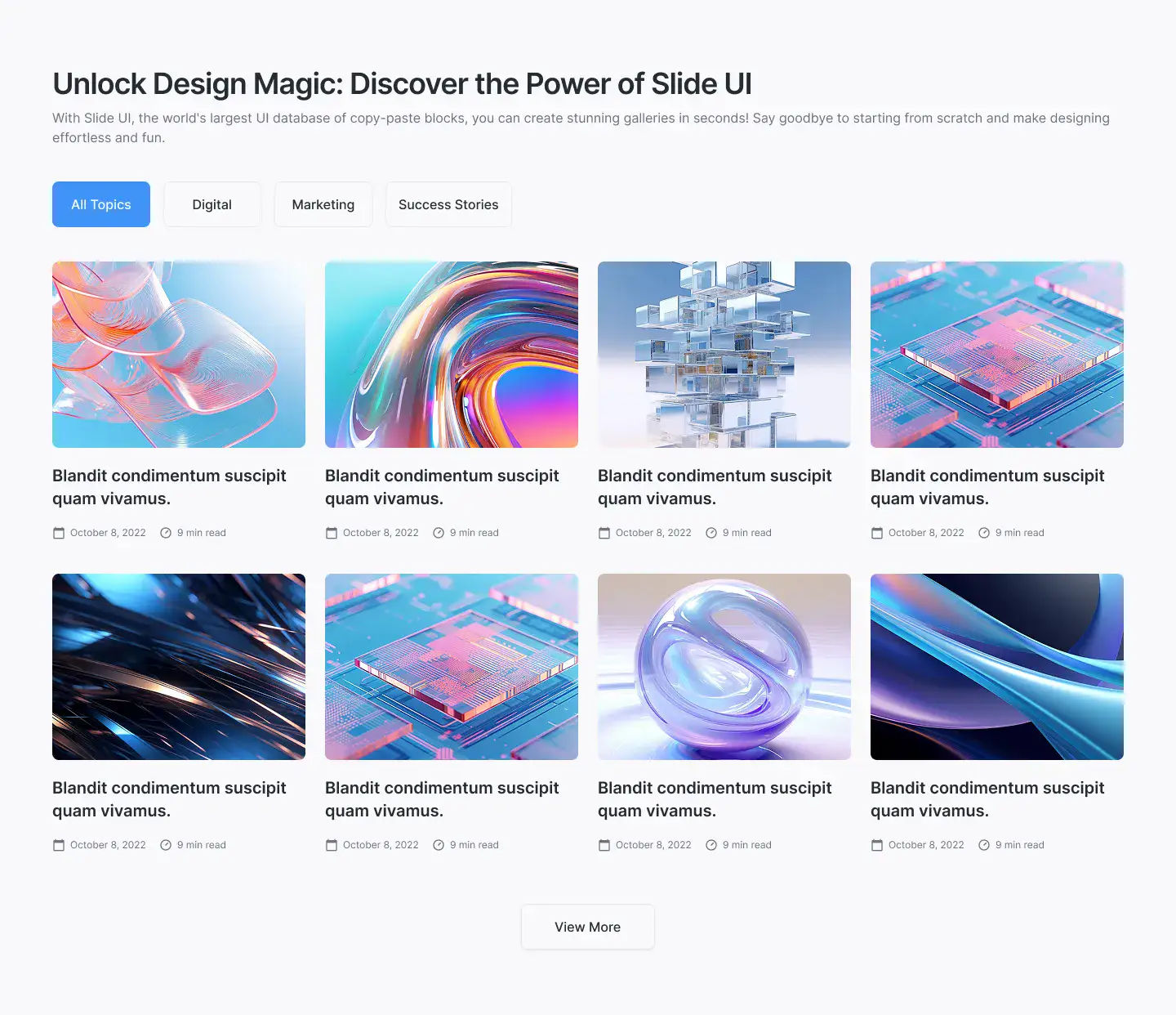 Display posts with preview cards, titles, and tags. Perfect for content hubs or design resource libraries.