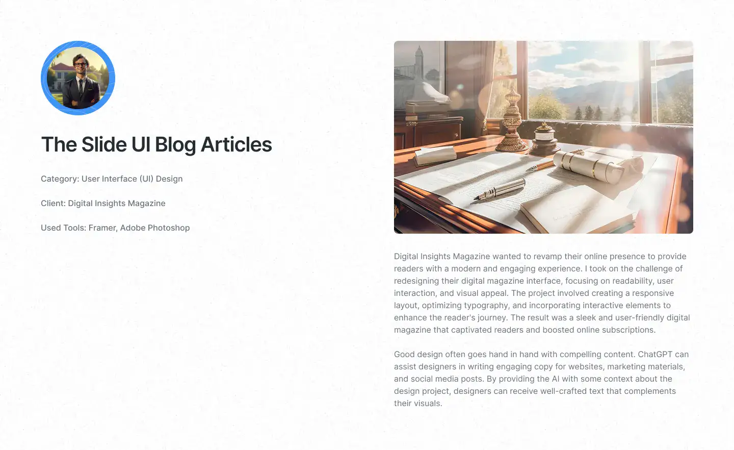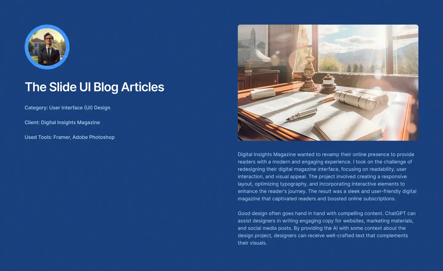 Show project results and stories in a professional way. Includes visual storytelling, stats, and client quotes.