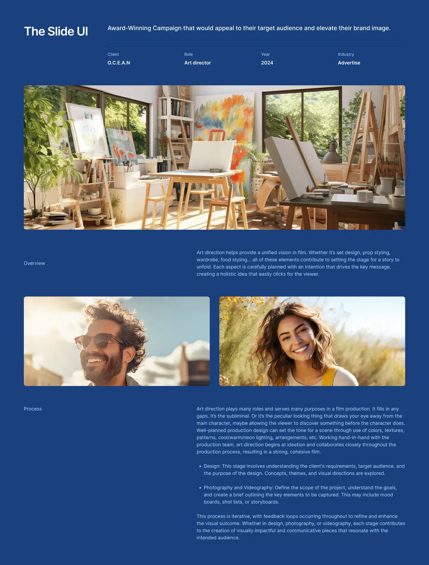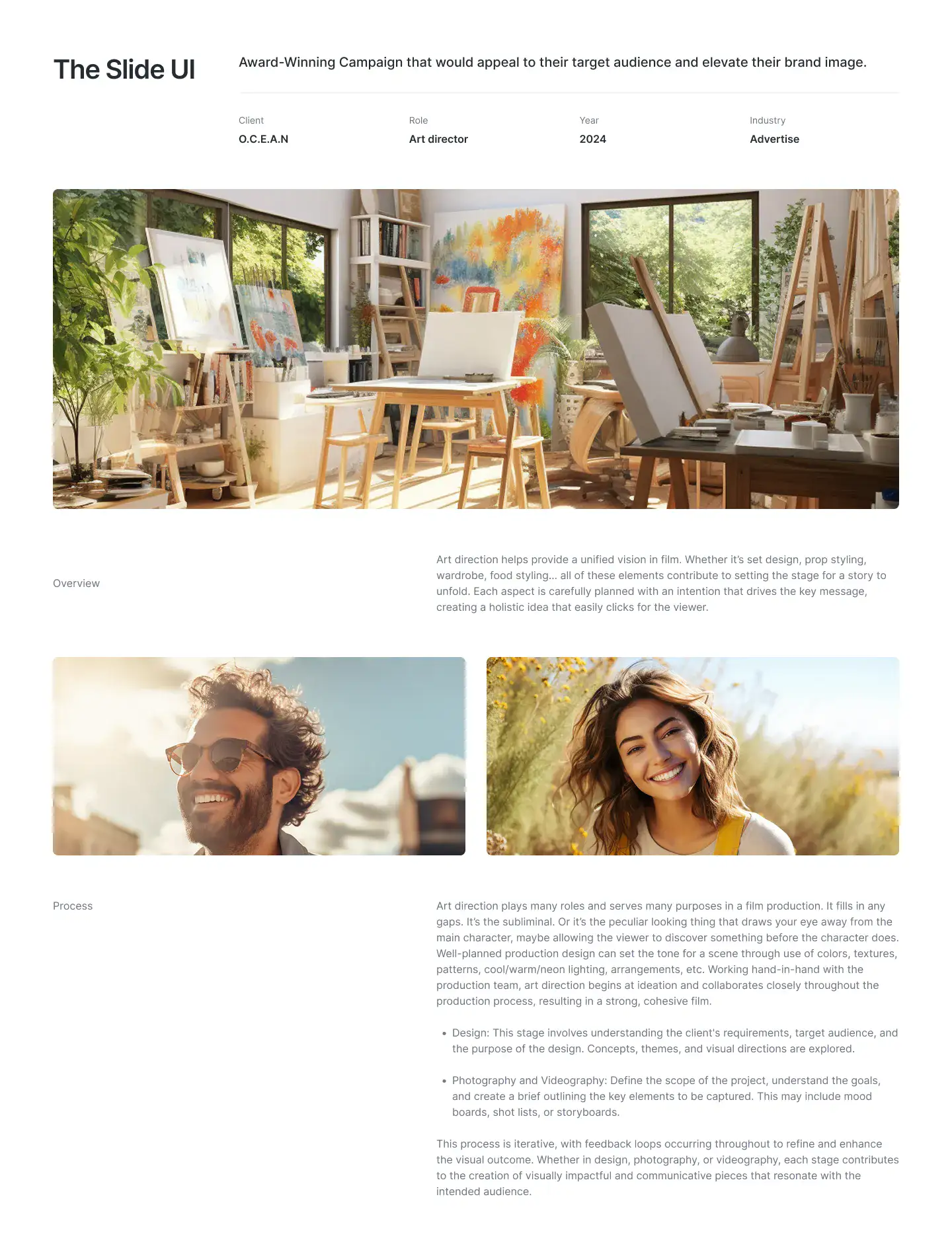 Show project results and stories in a professional way. Includes visual storytelling, stats, and client quotes.