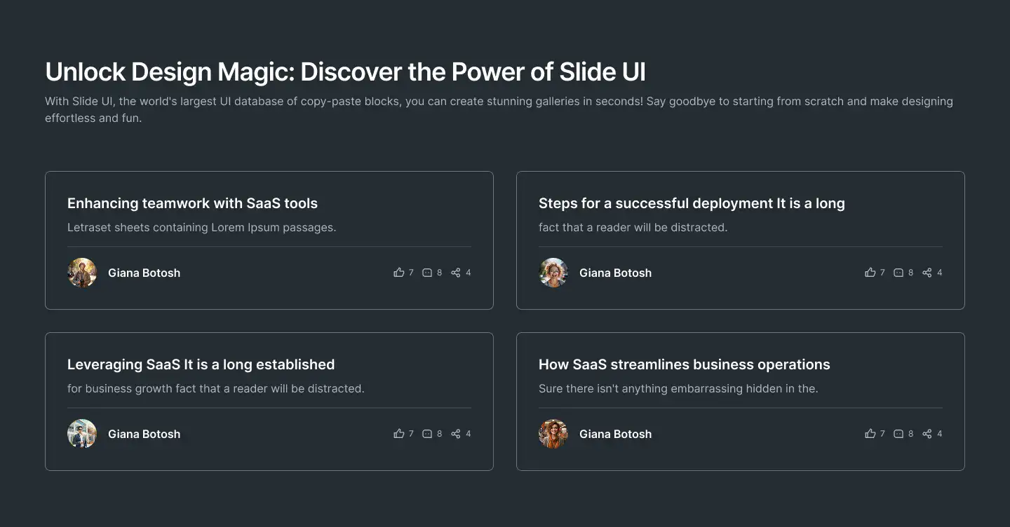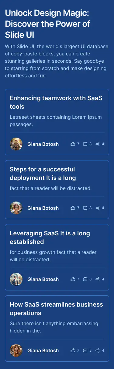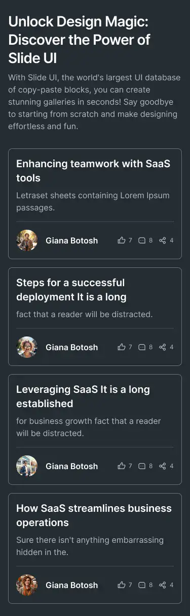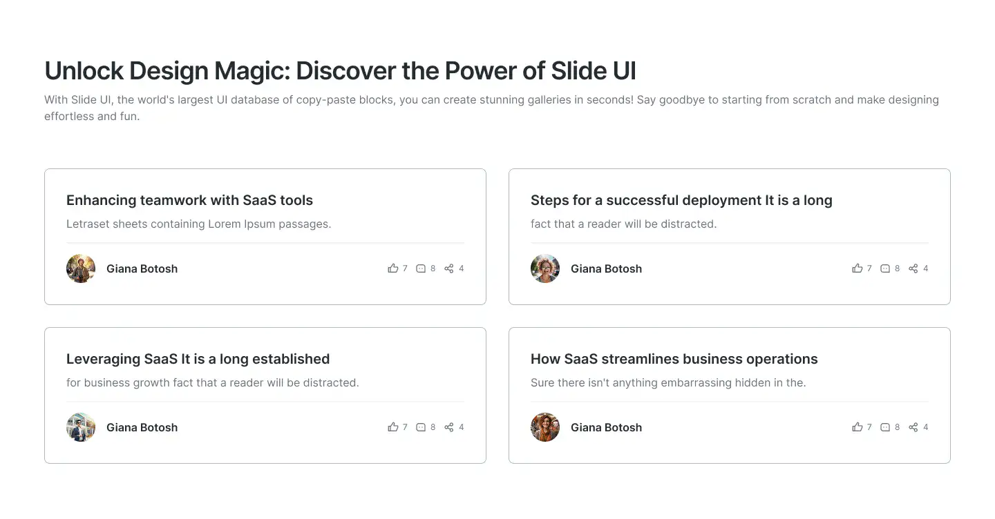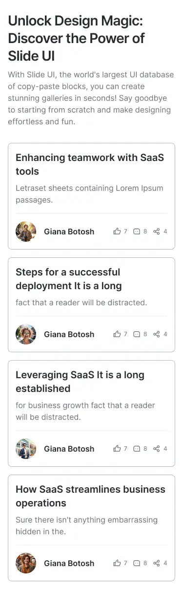 Display posts with preview cards, titles, and tags. Perfect for content hubs or design resource libraries.
