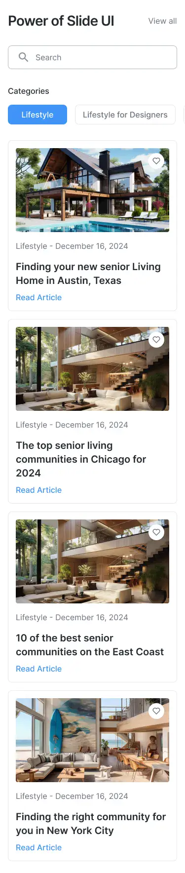Display posts with preview cards, titles, and tags. Perfect for content hubs or design resource libraries.