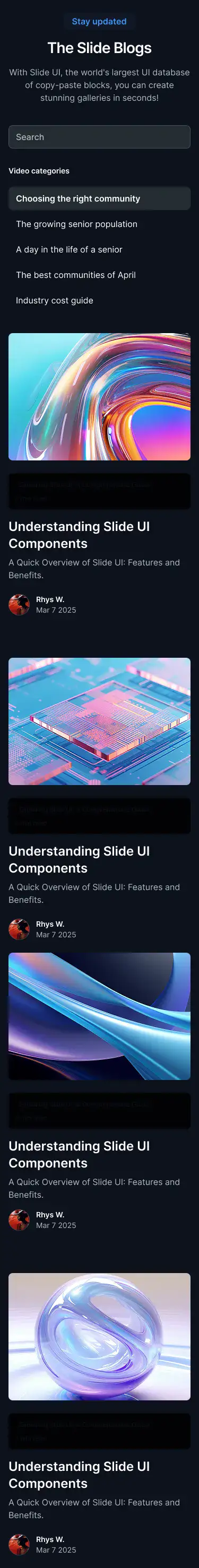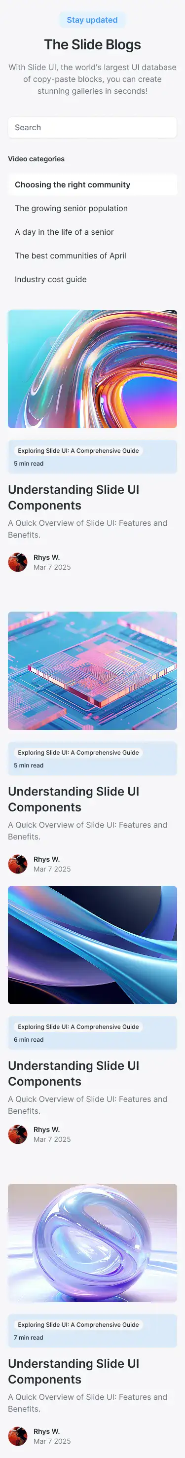 Display posts with preview cards, titles, and tags. Perfect for content hubs or design resource libraries.
