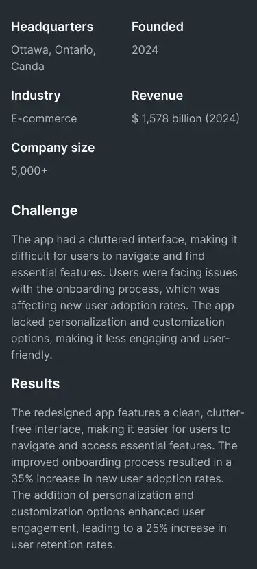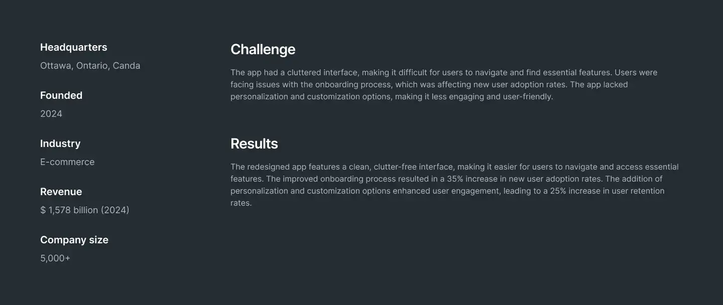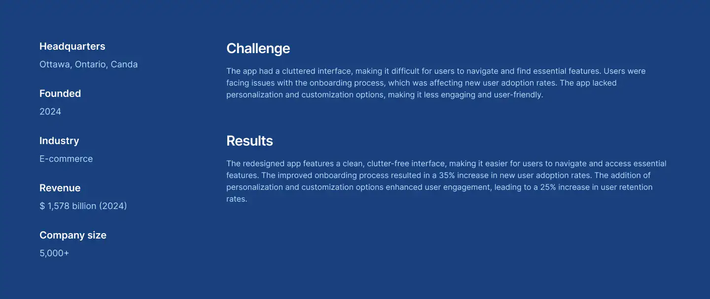 Show project results and stories in a professional way. Includes visual storytelling, stats, and client quotes.