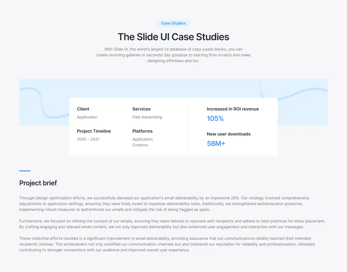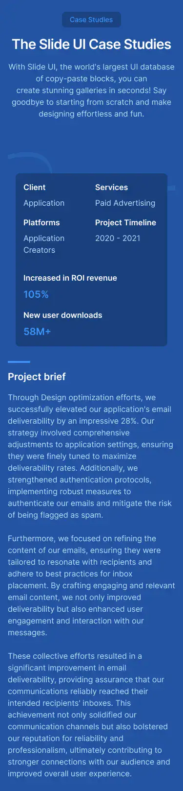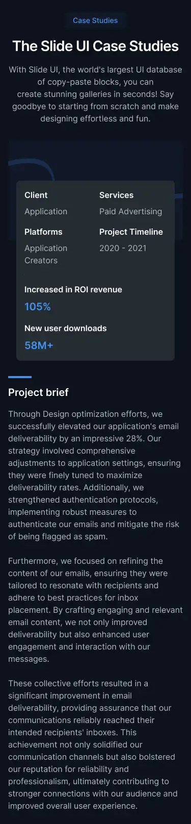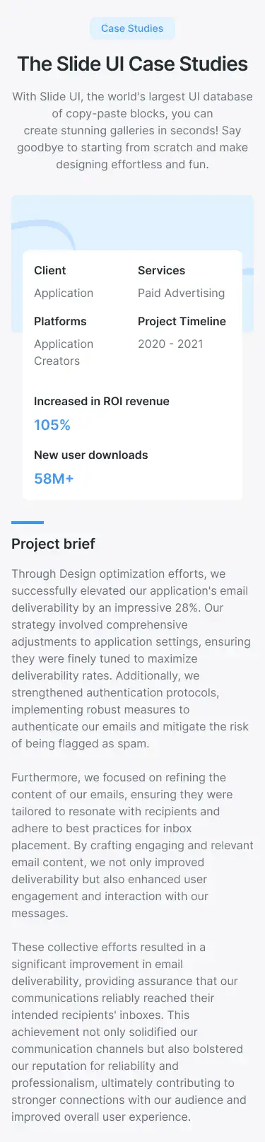 Show project results and stories in a professional way. Includes visual storytelling, stats, and client quotes.