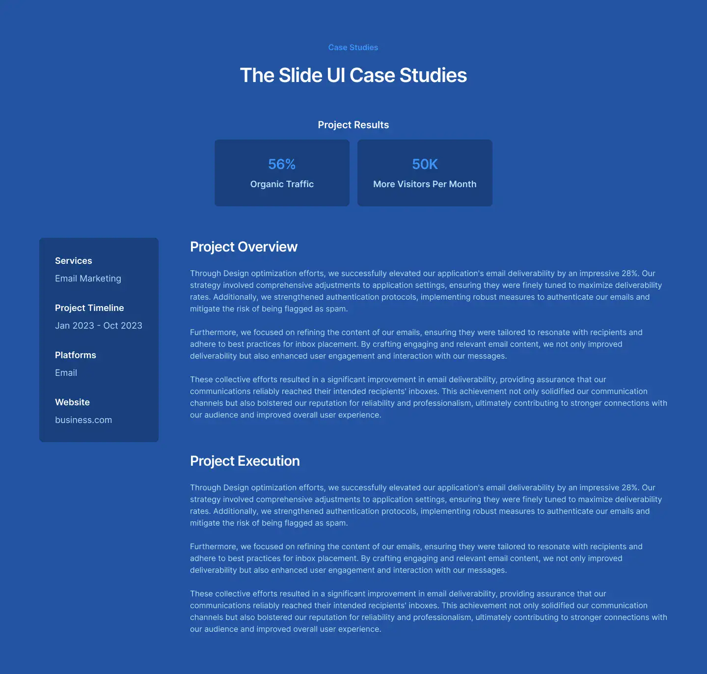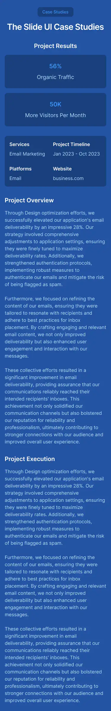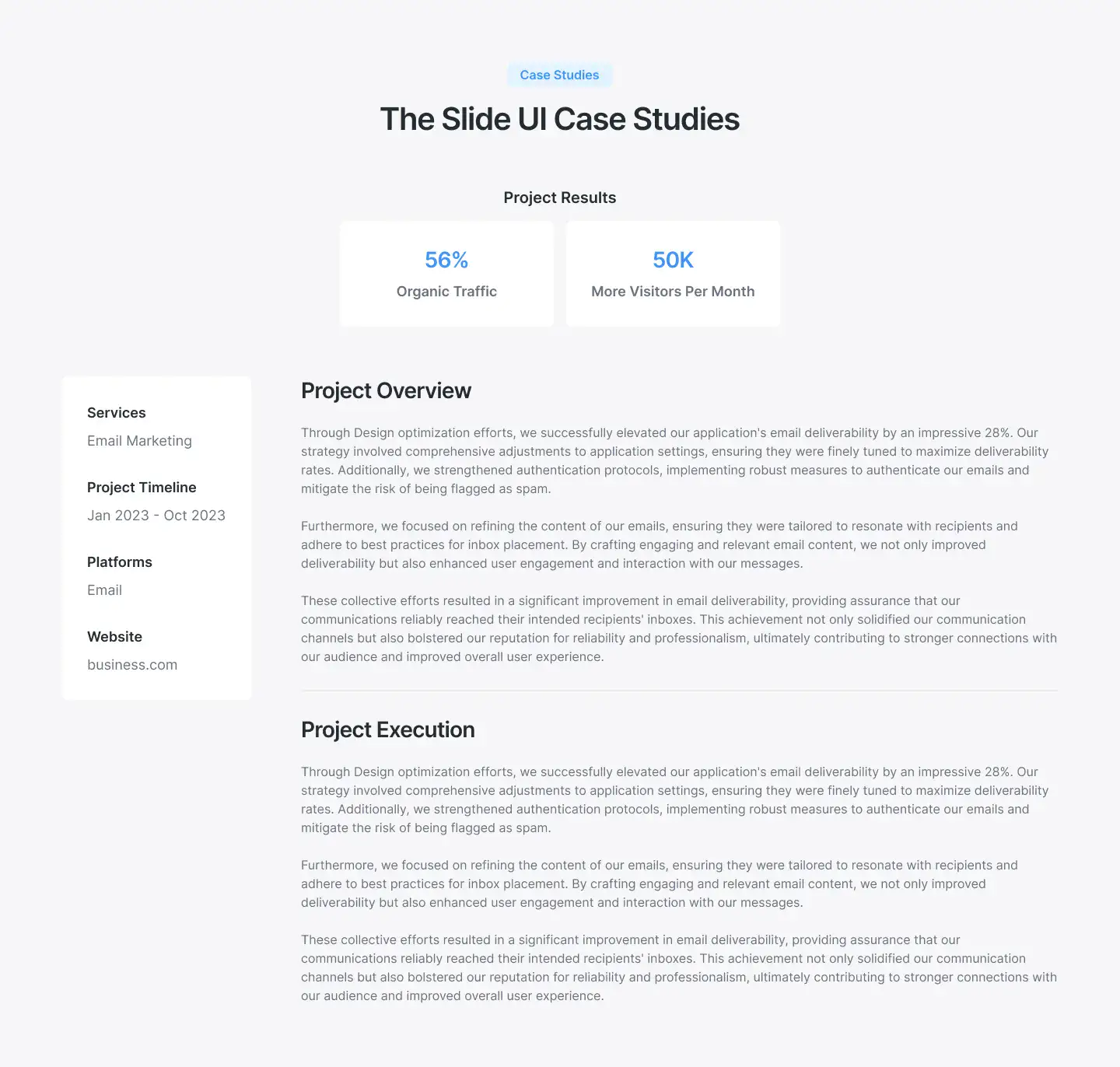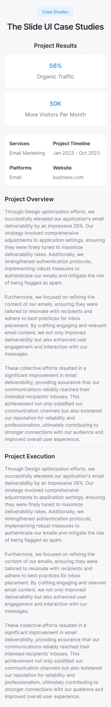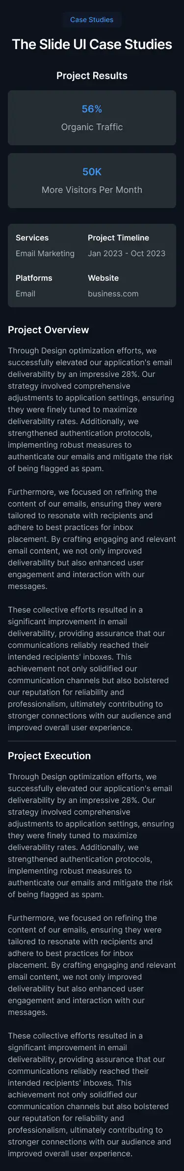 Show project results and stories in a professional way. Includes visual storytelling, stats, and client quotes.