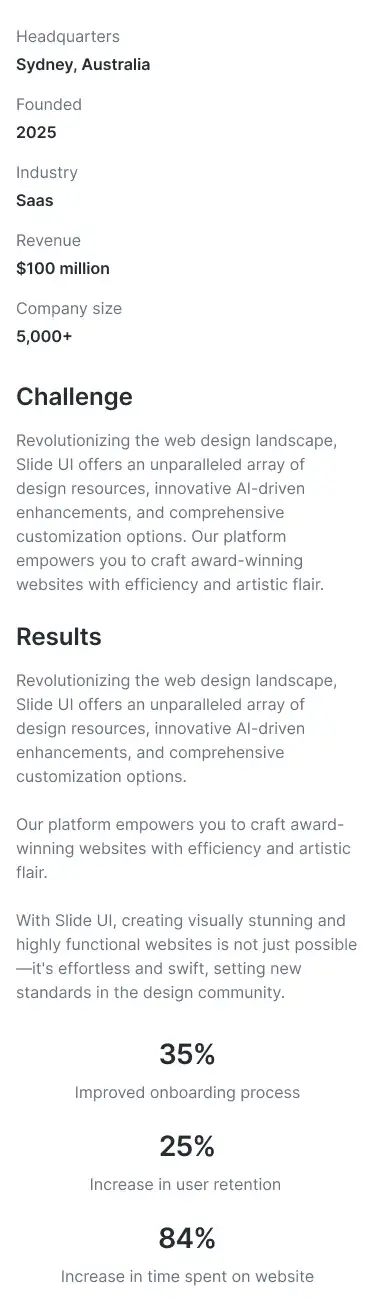 Show project results and stories in a professional way. Includes visual storytelling, stats, and client quotes.