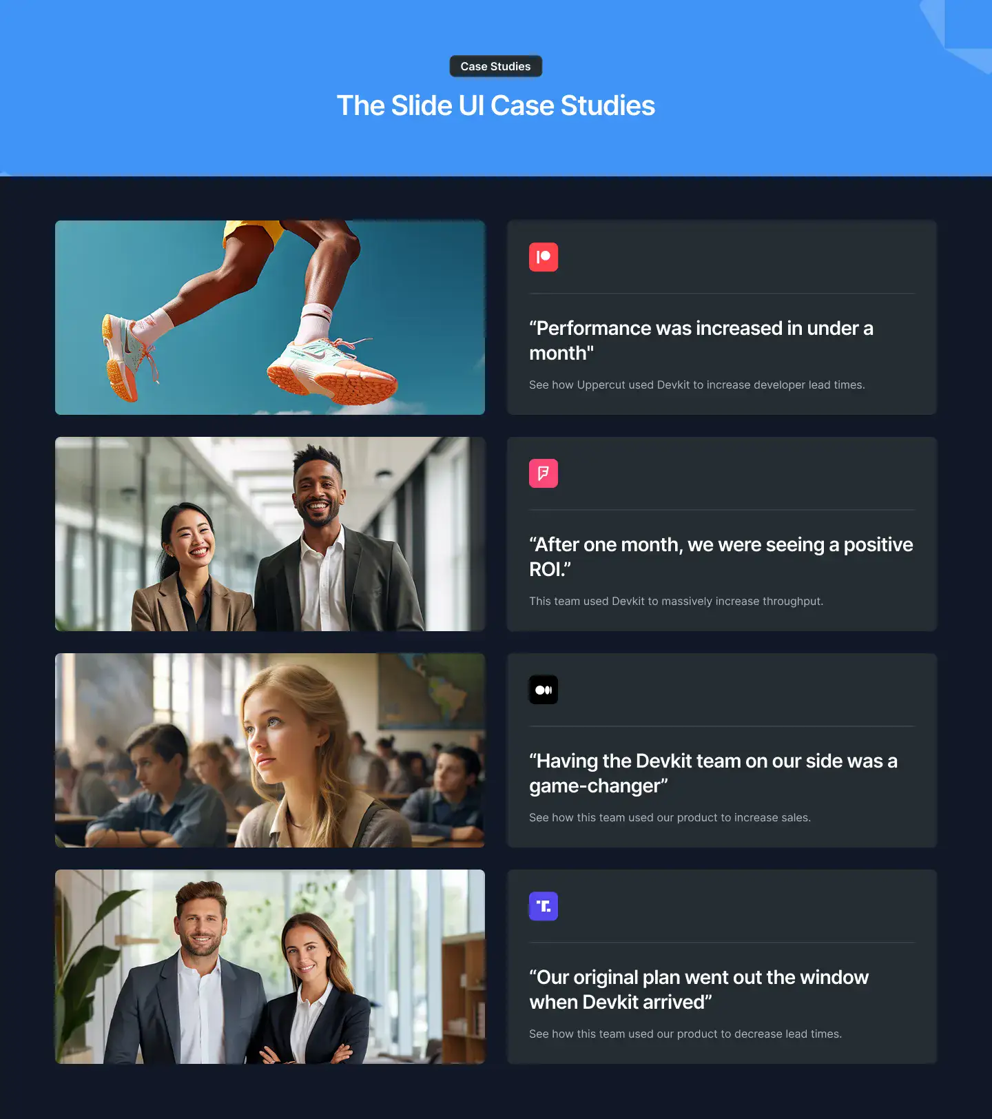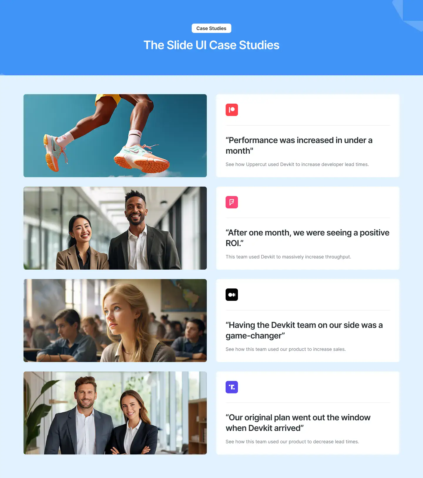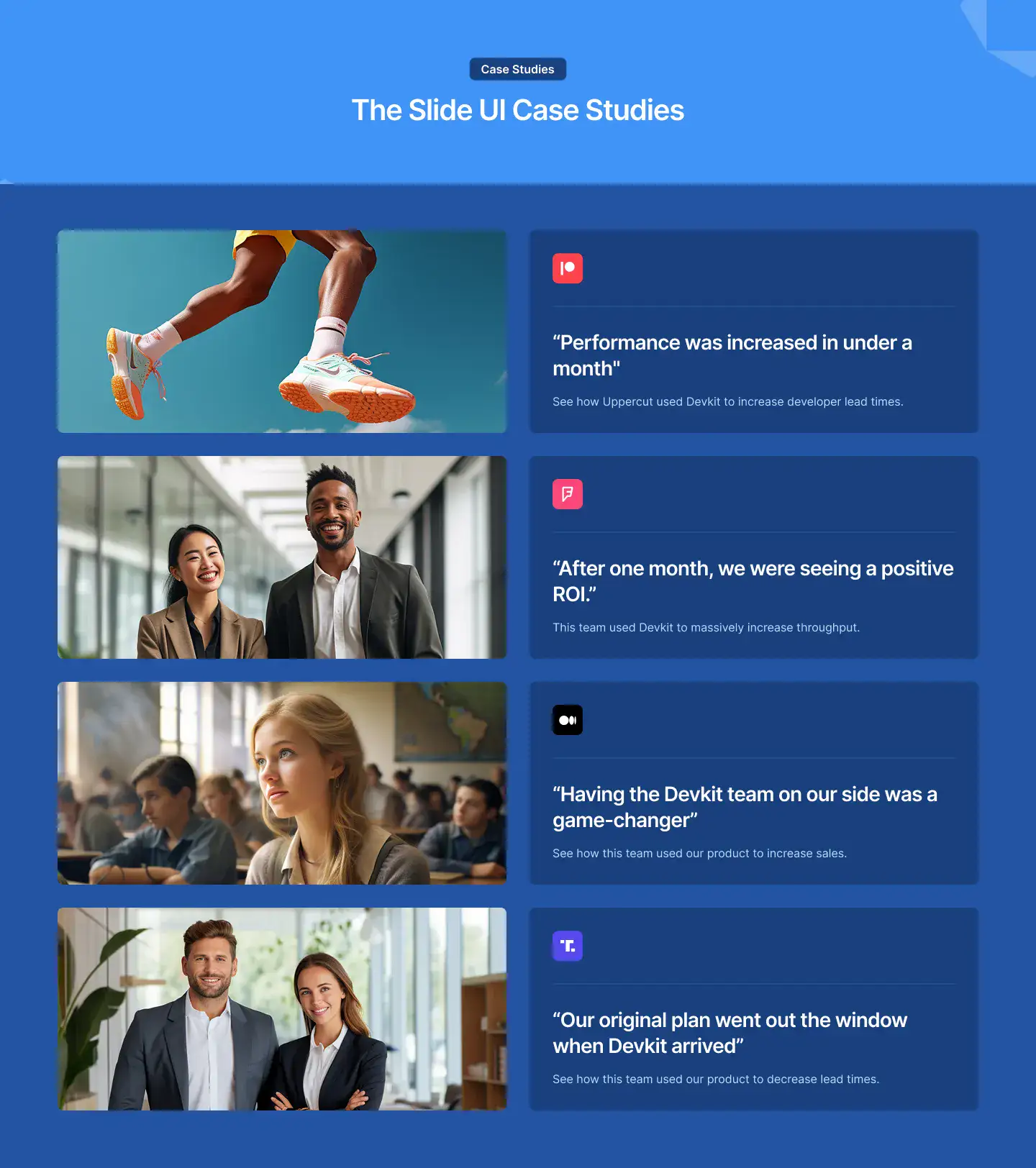 High-trust testimonial sections with avatars, logos, quotes, or carousels. Designed to increase credibility and conversions.