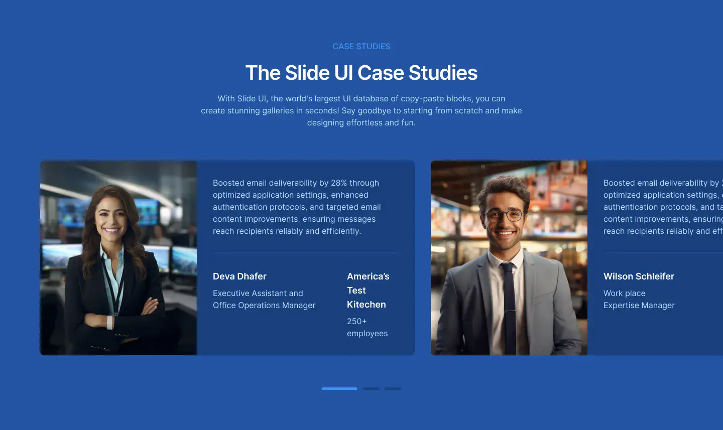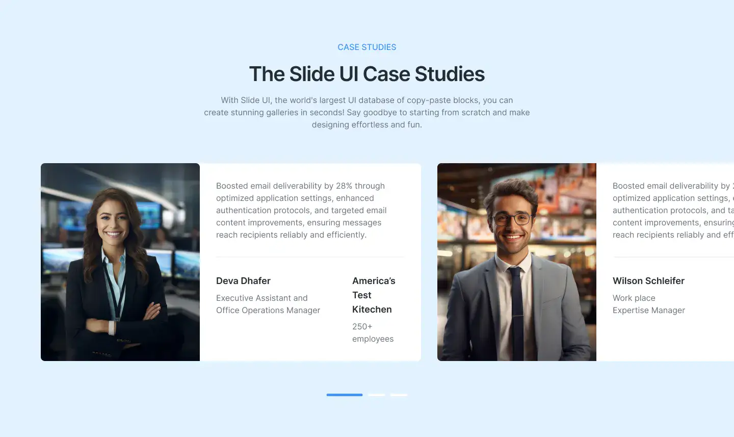 High-trust testimonial sections with avatars, logos, quotes, or carousels. Designed to increase credibility and conversions.