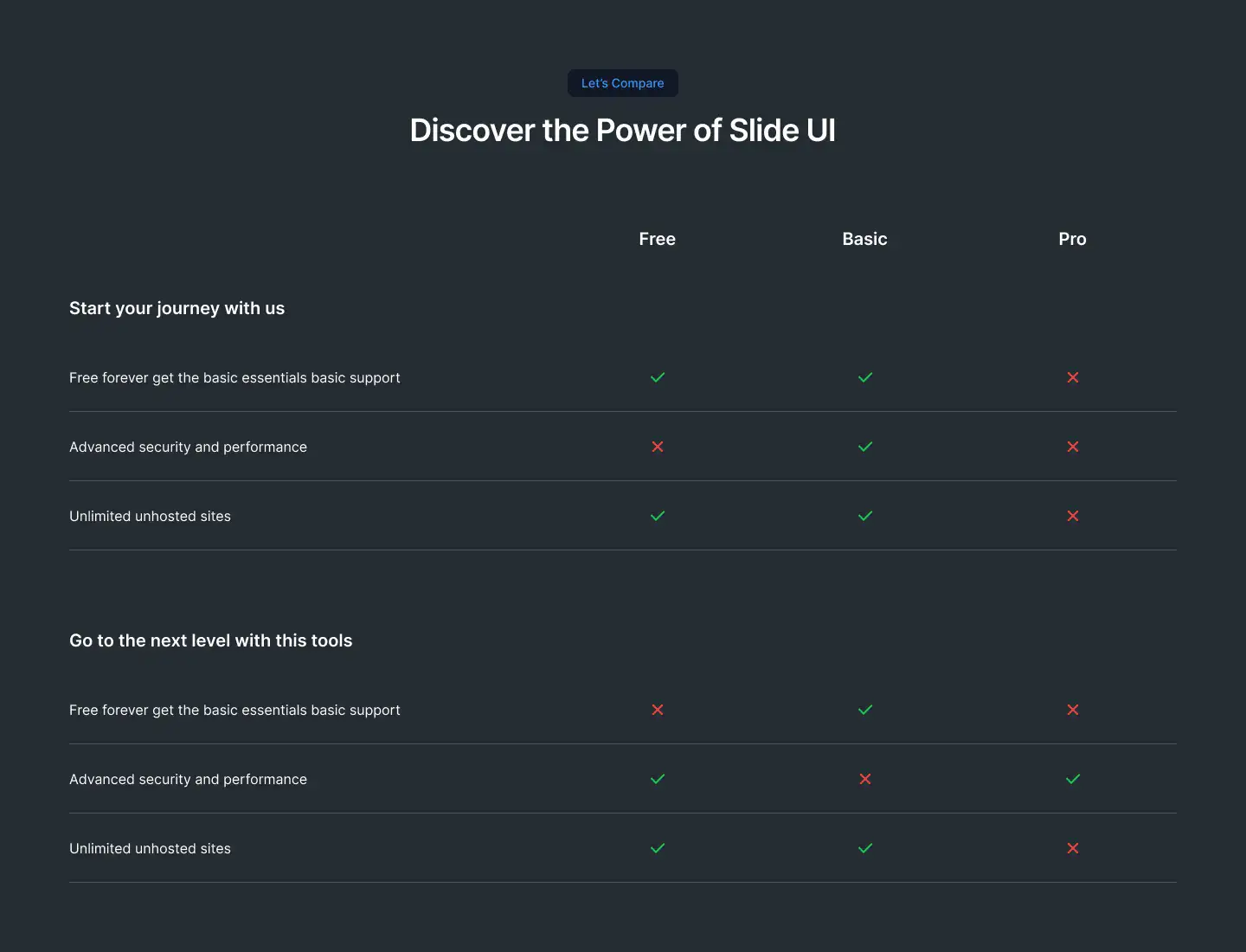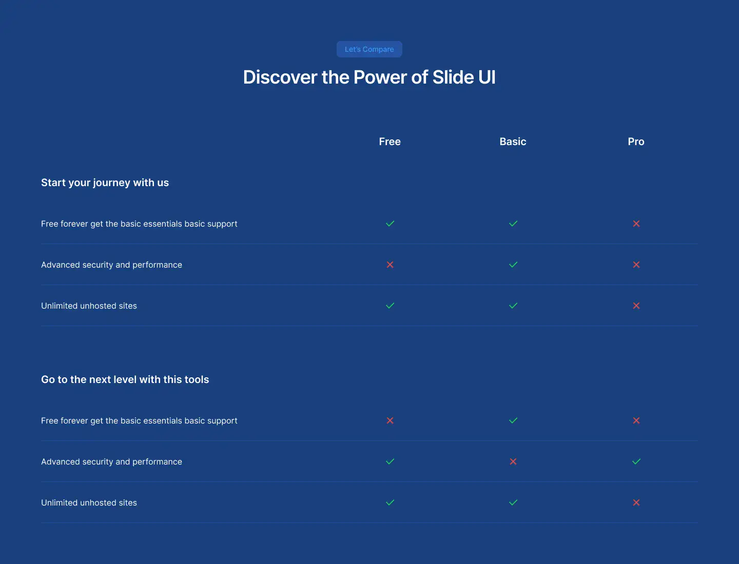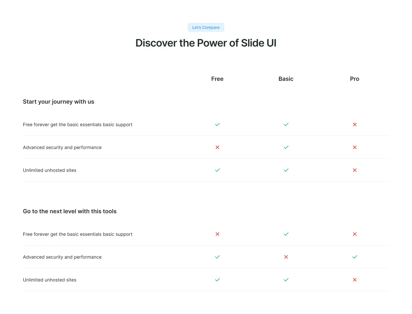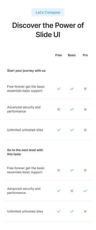 Break down feature differences clearly using side-by-side or table-style layouts. Great for upsell pages.