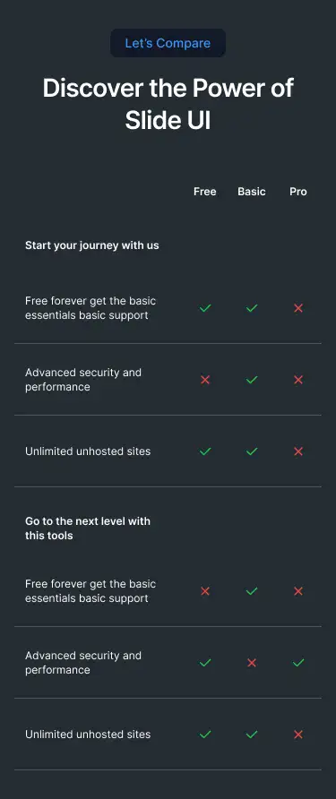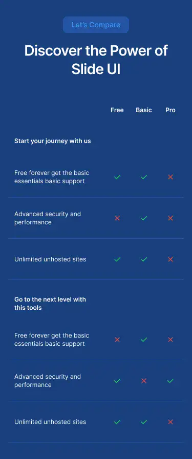 Comparison Layout for Figma — modern, themeable and responsive across Desktop, Tablet and Mobile. Includes Light, Dark and Accent modes for fast customisation. Ideal for Ecommerce, Fintech, Government.