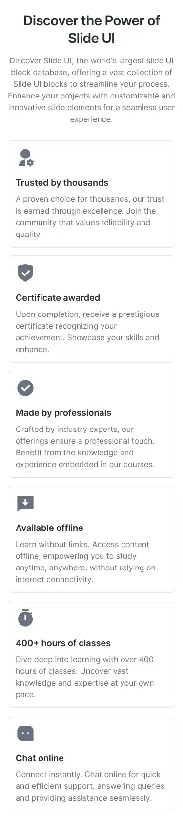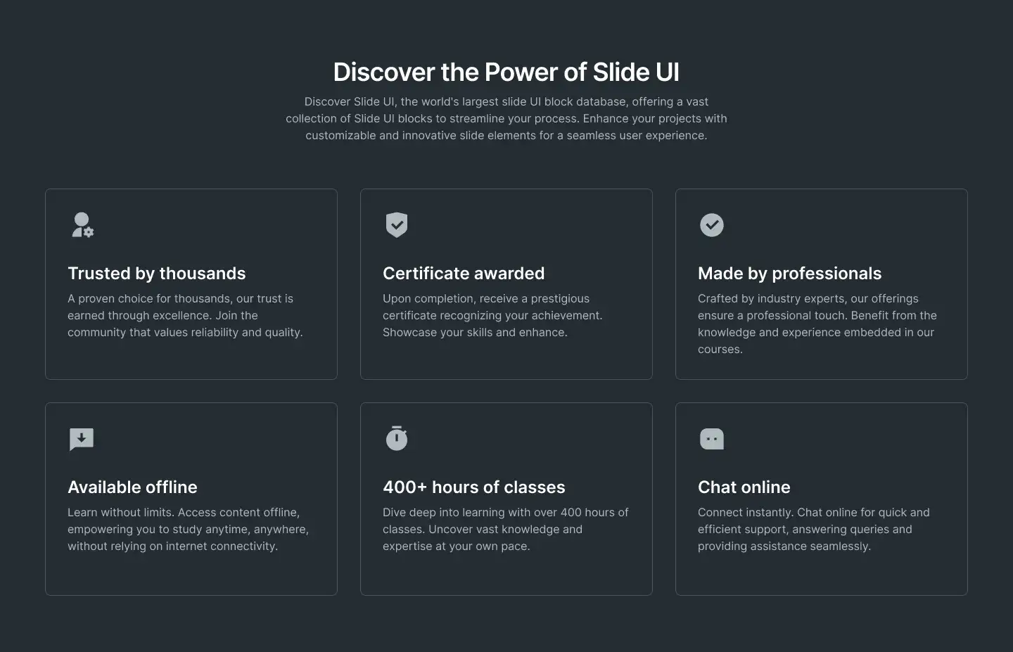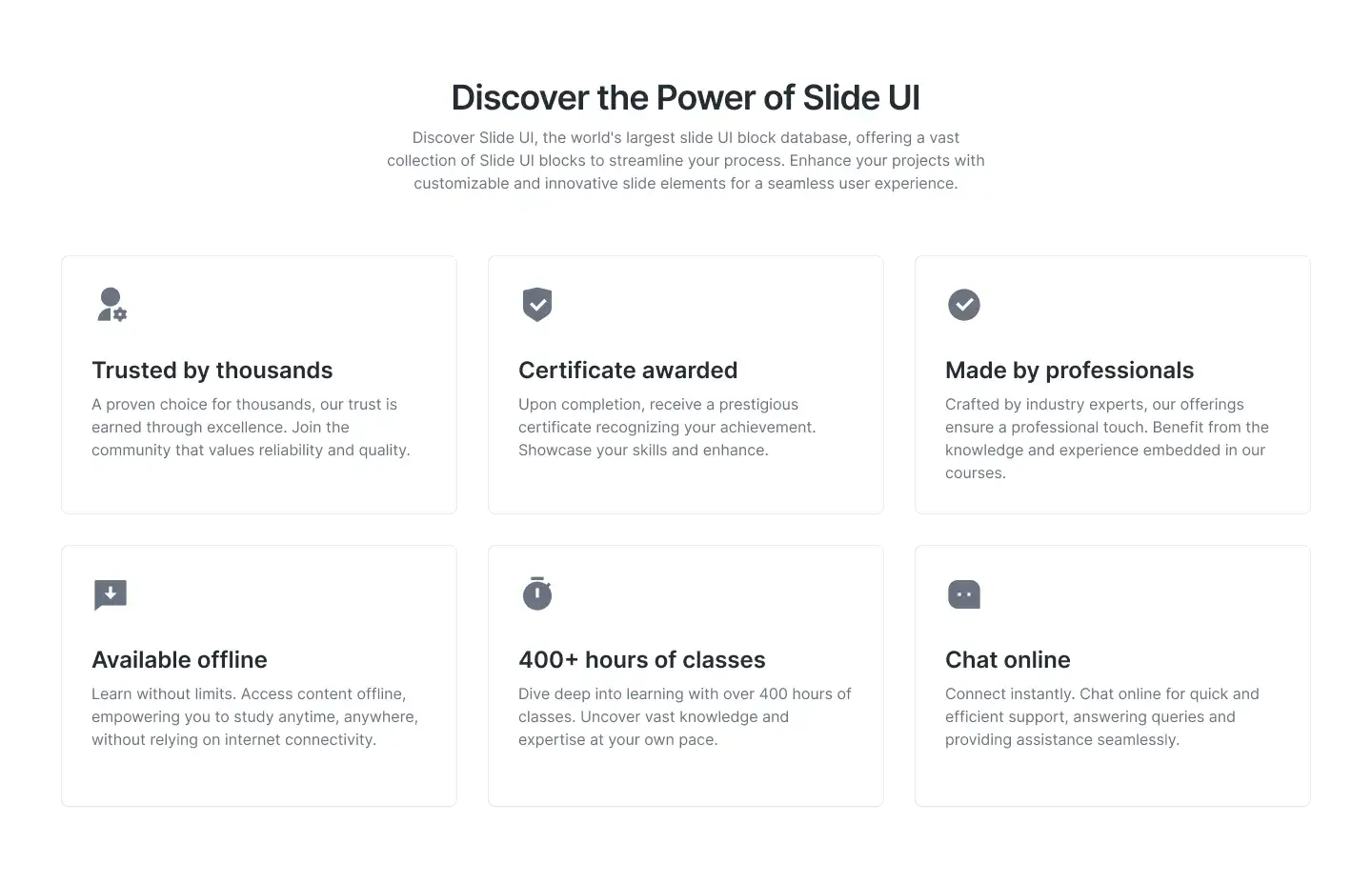 Grid or column-based layouts to highlight your best product features — fast, skimmable, and easy to reuse.