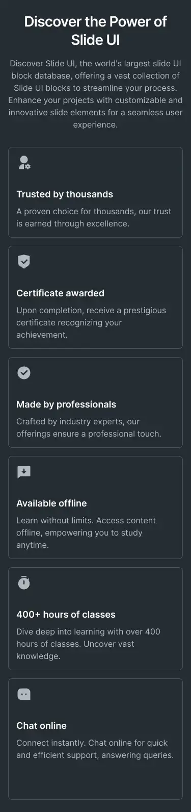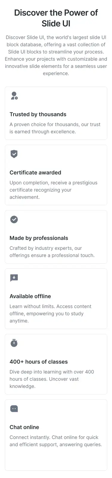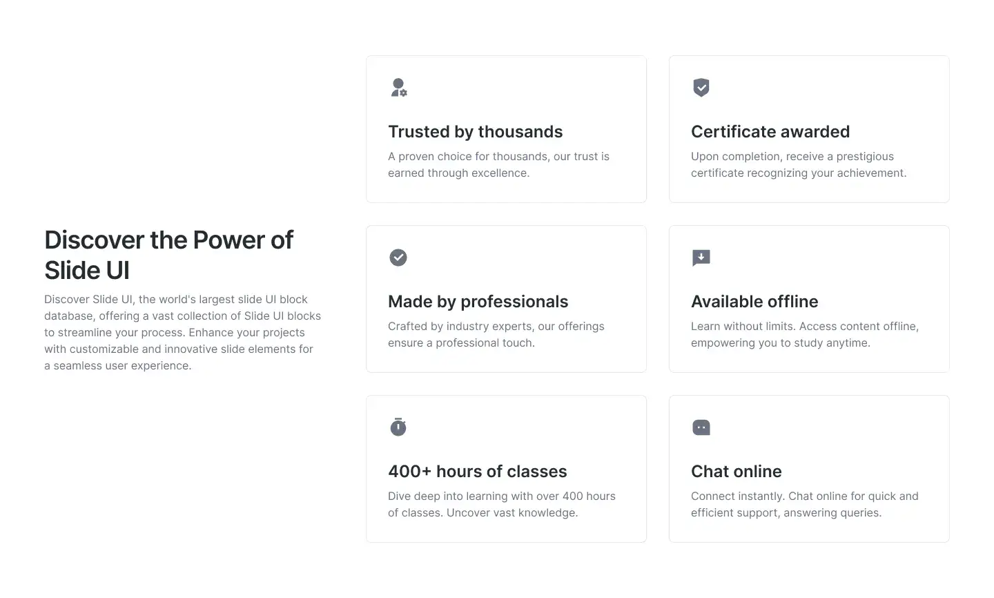 Grid or column-based layouts to highlight your best product features — fast, skimmable, and easy to reuse.