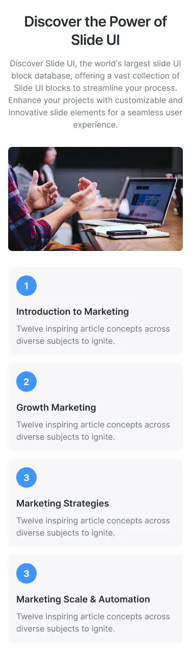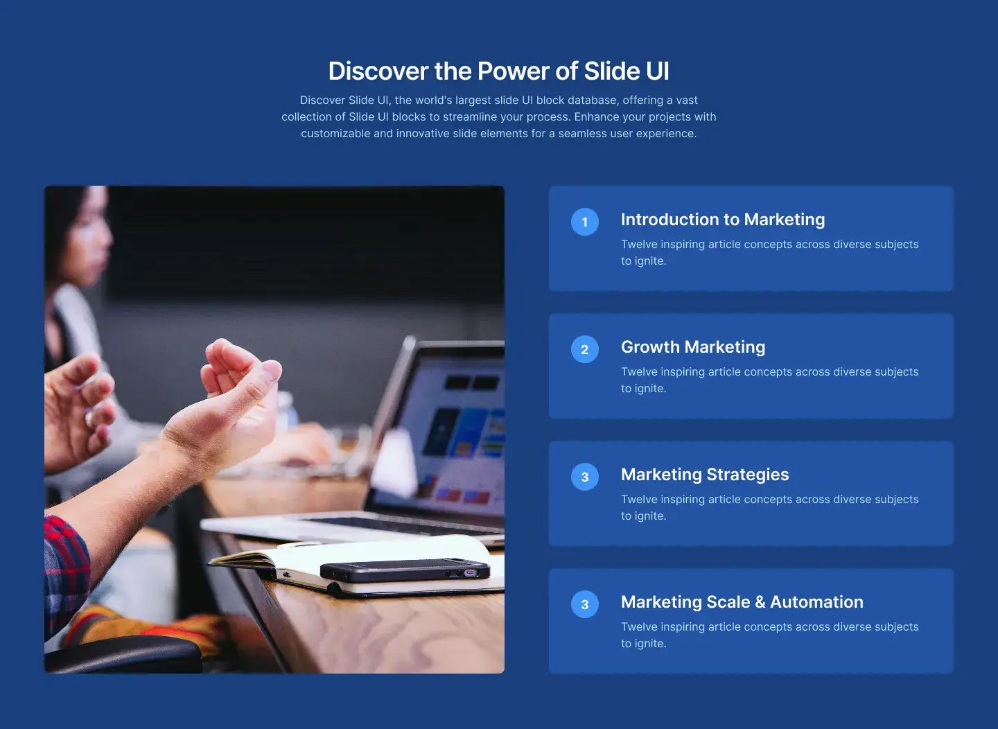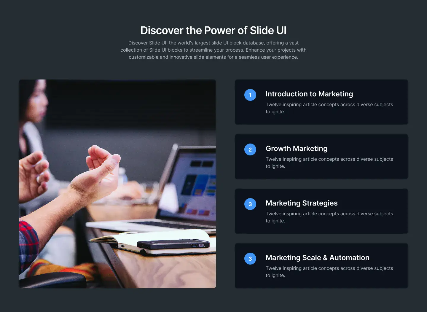 View Hero blocksShowcase processes, features, or onboarding in a clean 3–4 step layout. These are perfect for explaining complex ideas simply.
