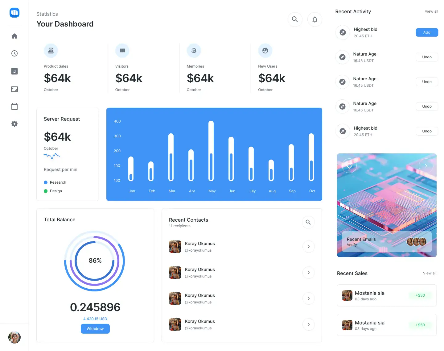 Performance, analytics, revenue, and admin dashboards designed for clarity and real SaaS products.