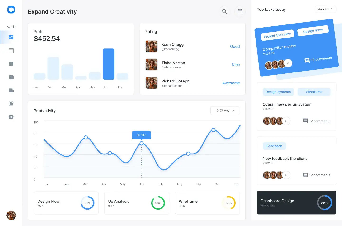 Performance, analytics, revenue, and admin dashboards designed for clarity and real SaaS products.