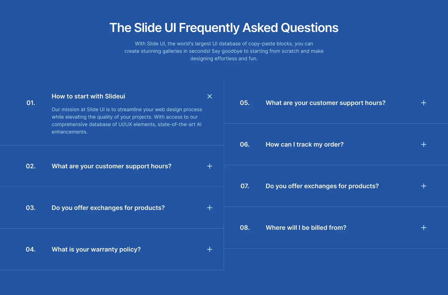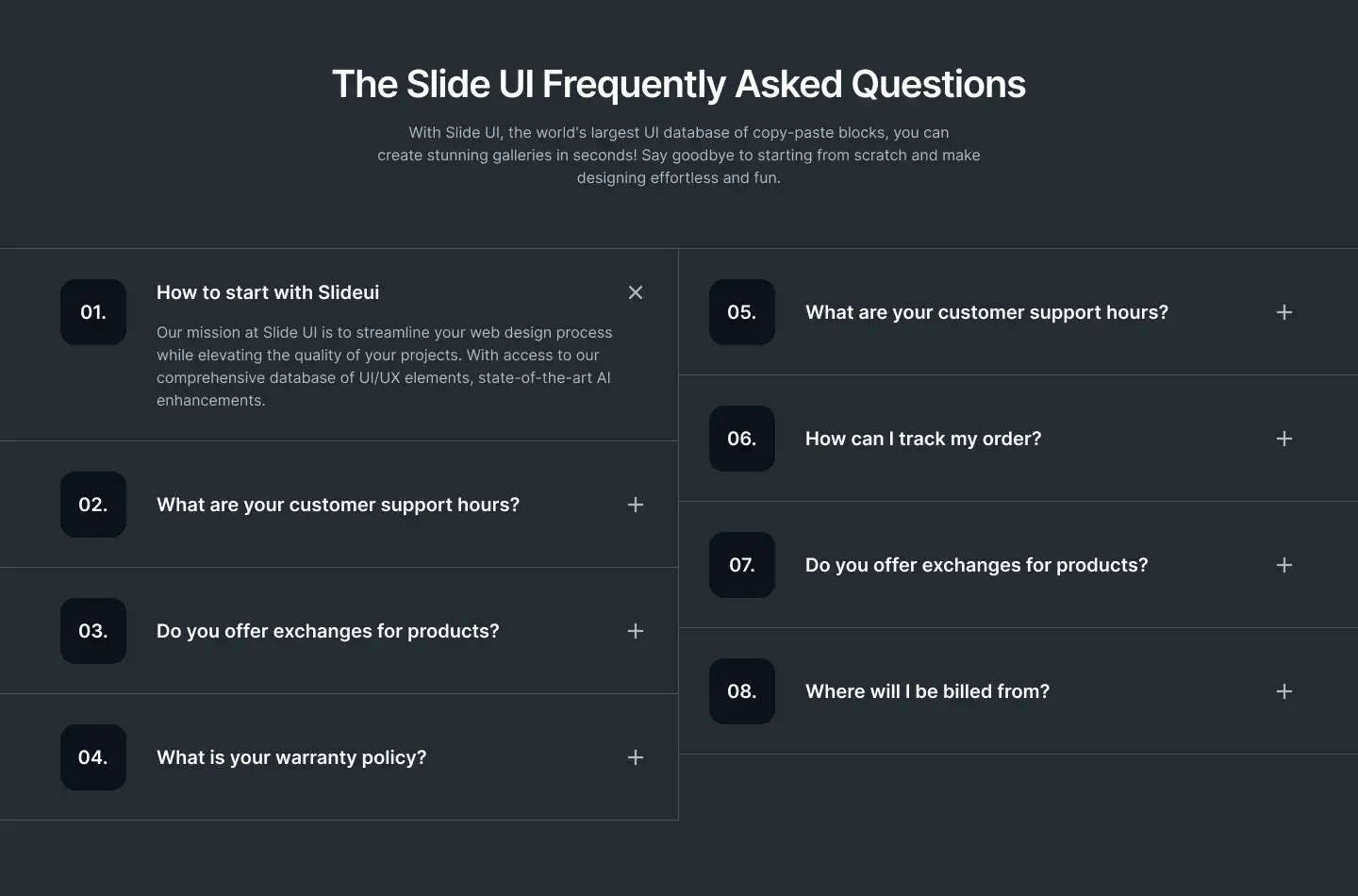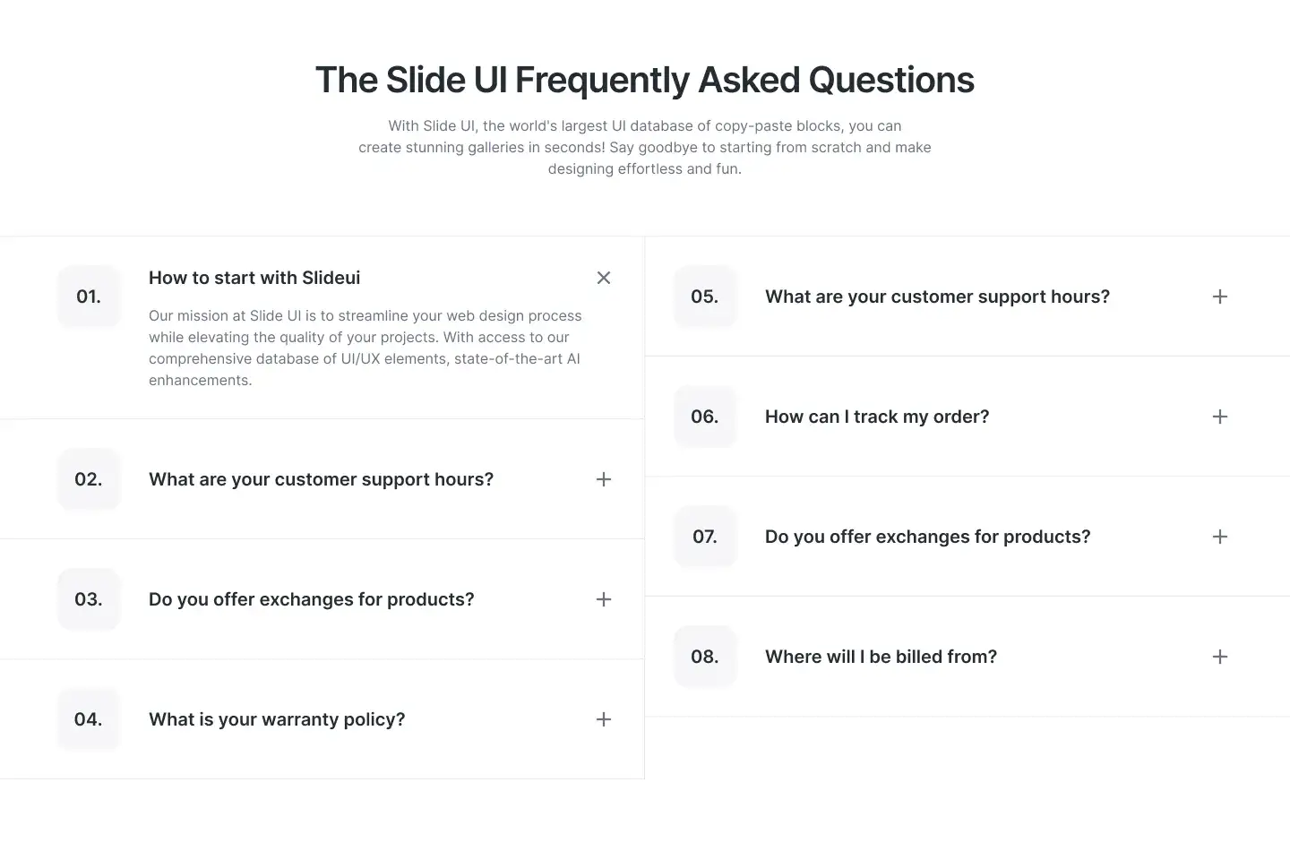 Grid or column-based layouts to highlight your best product features — fast, skimmable, and easy to reuse.