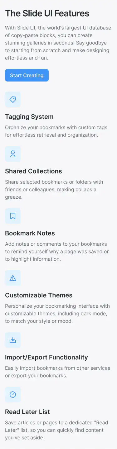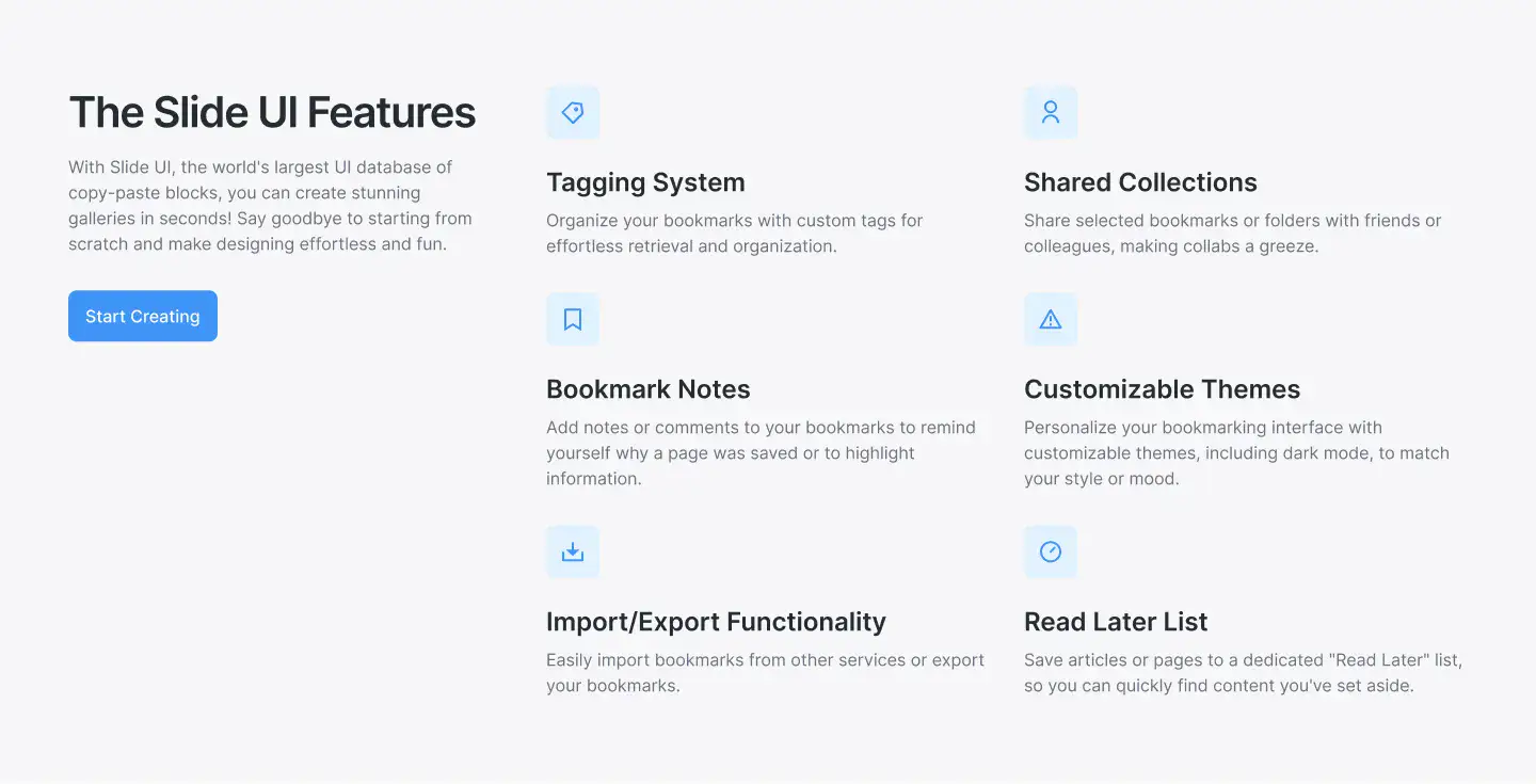 Grid or column-based layouts to highlight your best product features — fast, skimmable, and easy to reuse.