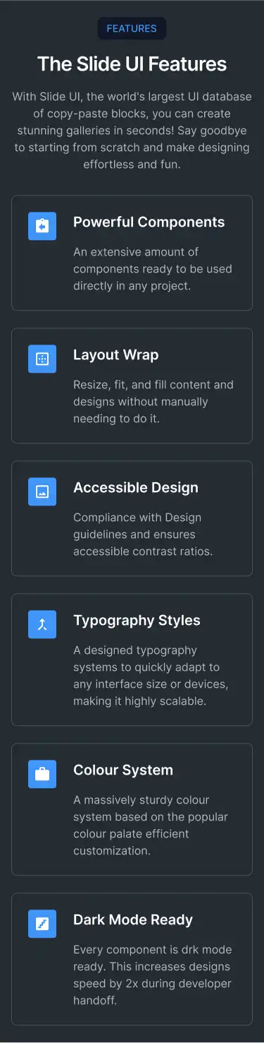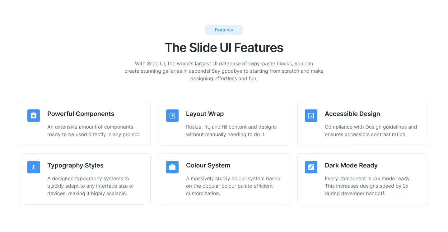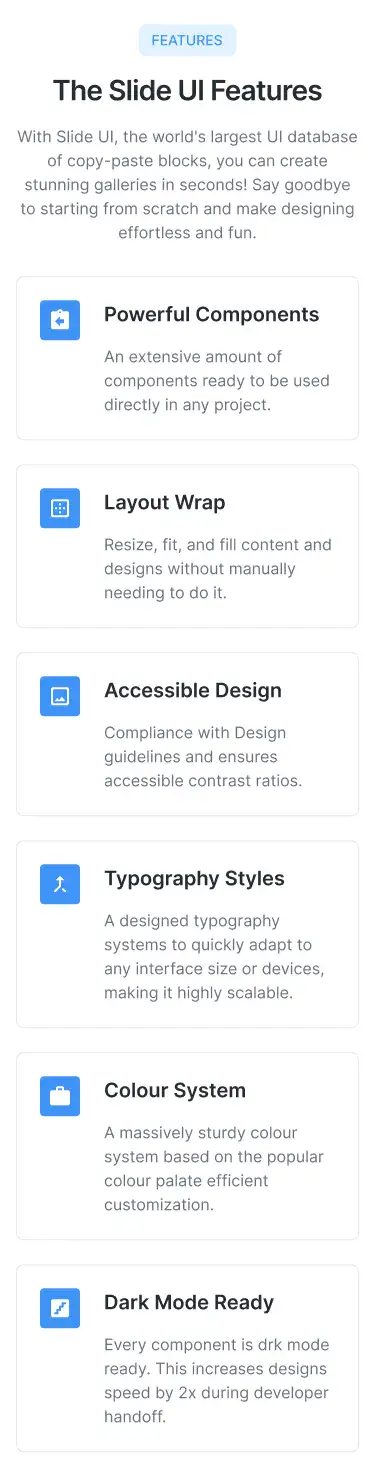 Grid or column-based layouts to highlight your best product features — fast, skimmable, and easy to reuse.