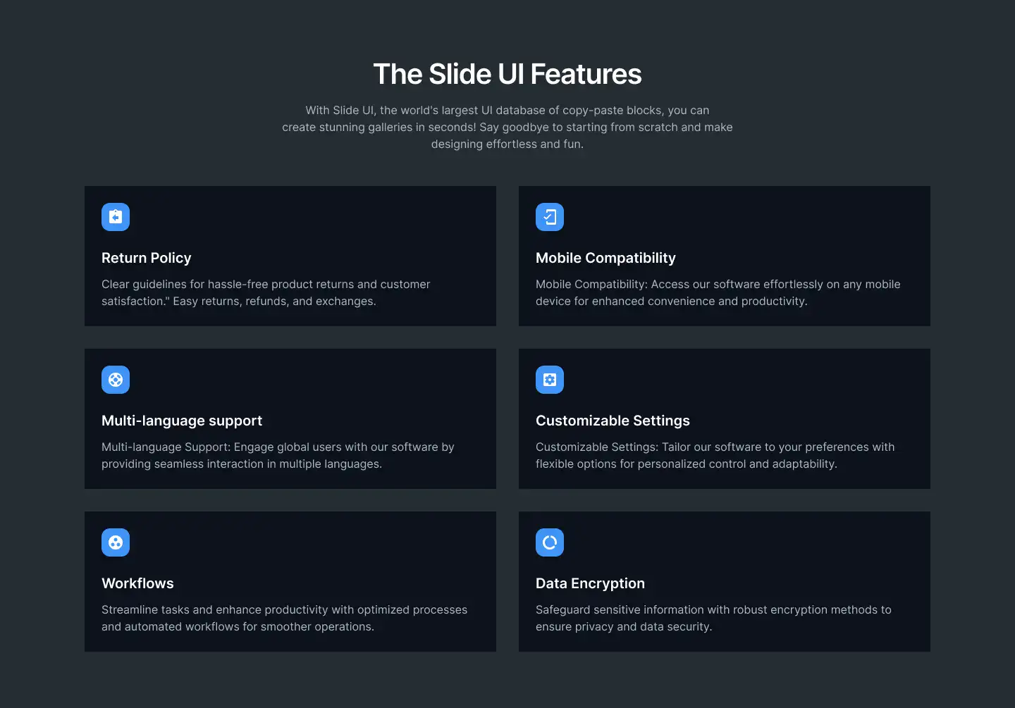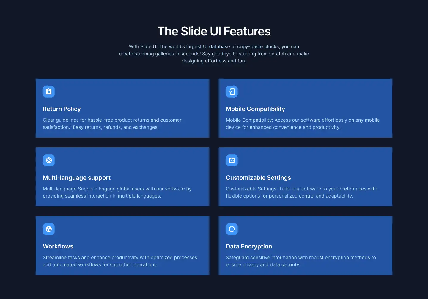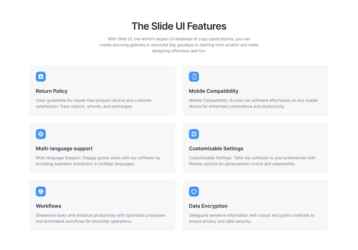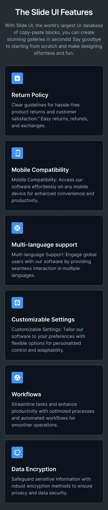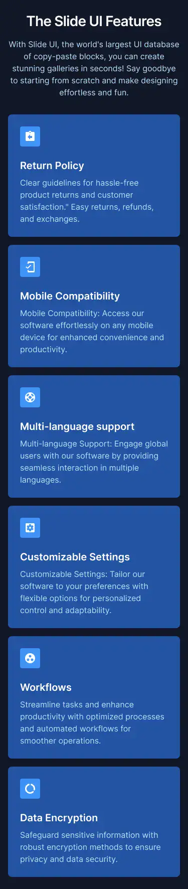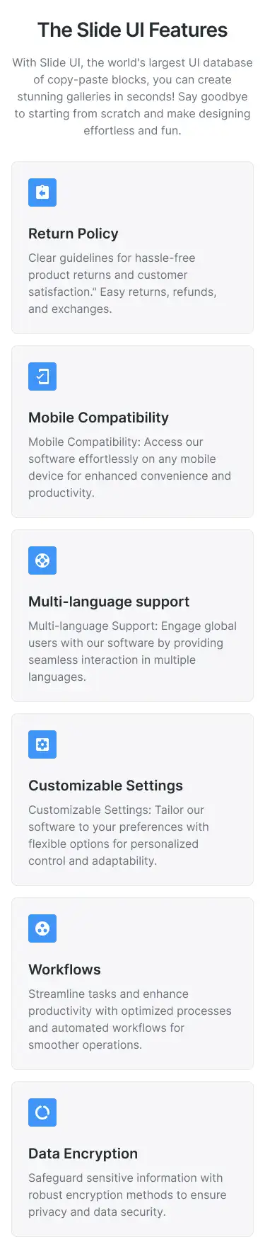 Grid or column-based layouts to highlight your best product features — fast, skimmable, and easy to reuse.
